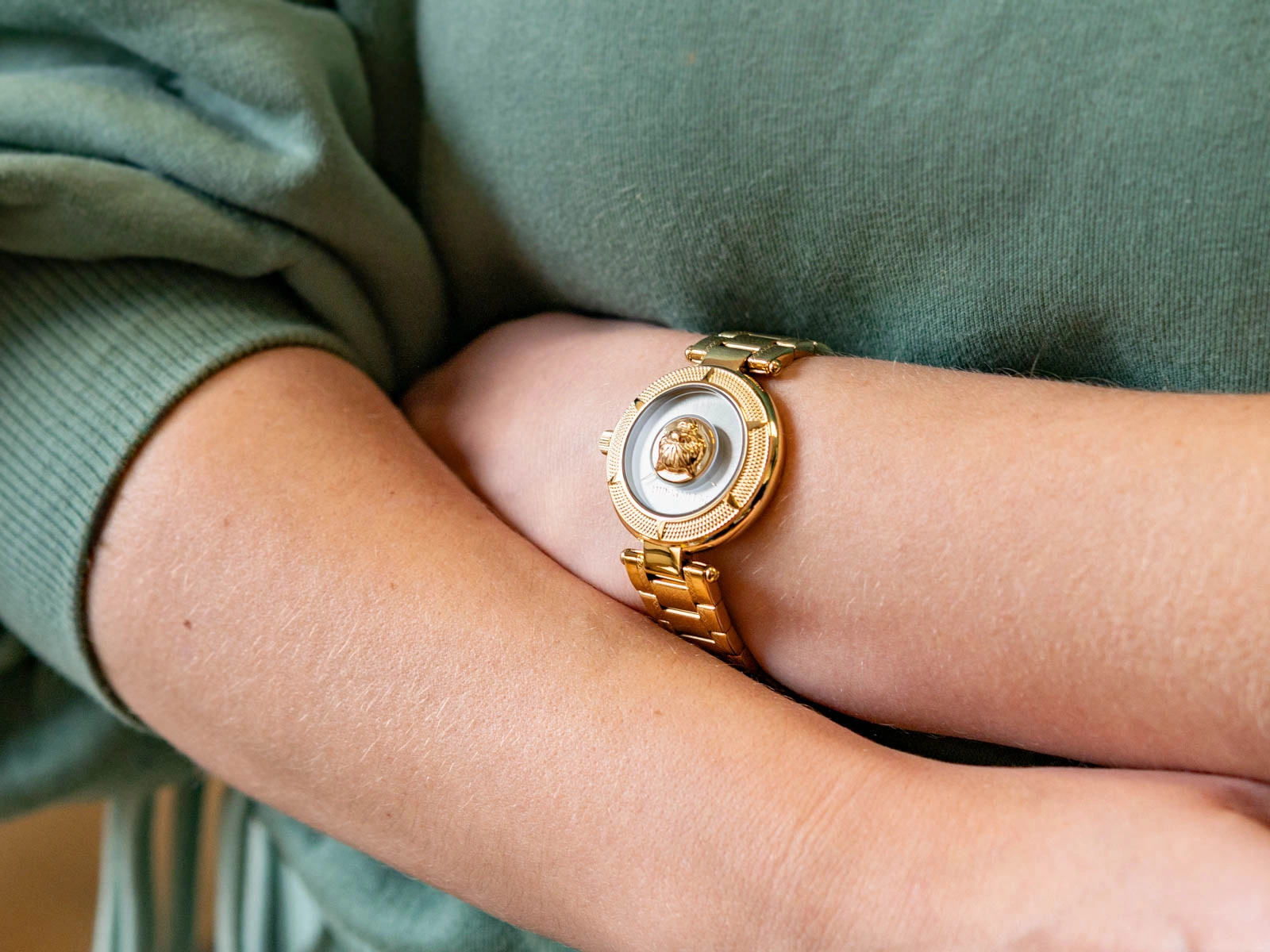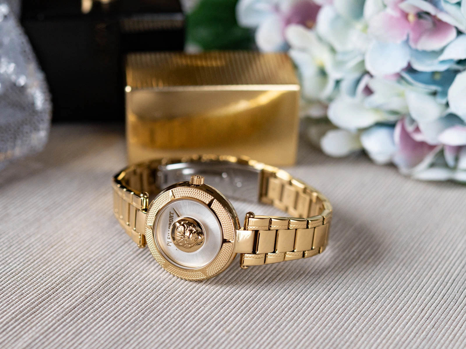 Plein Sport PSCEA0825 Opium to zegarek, który nie uznaje półśrodków. To manifest odwagi i pewności siebie zamknięty w formie, która łączy sportową energię z nutą luksusowej ekstrawagancji. Stworzony dla kobiet, które nie idą na kompromisy i lubią podkreślać swoją indywidualność. Już pierwszy kontakt z tym modelem zdradza jego wyjątkowy charakter. Złota koperta wykonana ze stali szlachetnej przyciąga światło niczym magnes, zachwycając subtelnym połyskiem i perfekcyjnym wykończeniem. Jej zdecydowane linie i solidna konstrukcja podkreślają siłę designu, a dopasowana bransoleta w tym samym odcieniu tworzy spójną i elegancką całość, w której nowoczesność spotyka się z ponadczasowym stylem. Na tle srebrnej tarczy dumnie prezentuje się złoty wizerunek tygrysa - symbol energii, odwagi i instynktu zwycięzcy. To nie tylko znak rozpoznawczy marki Plein Sport, ale również odzwierciedlenie jej filozofii czyli życia pełnego pasji, determinacji i nieustannego dążenia do celu.