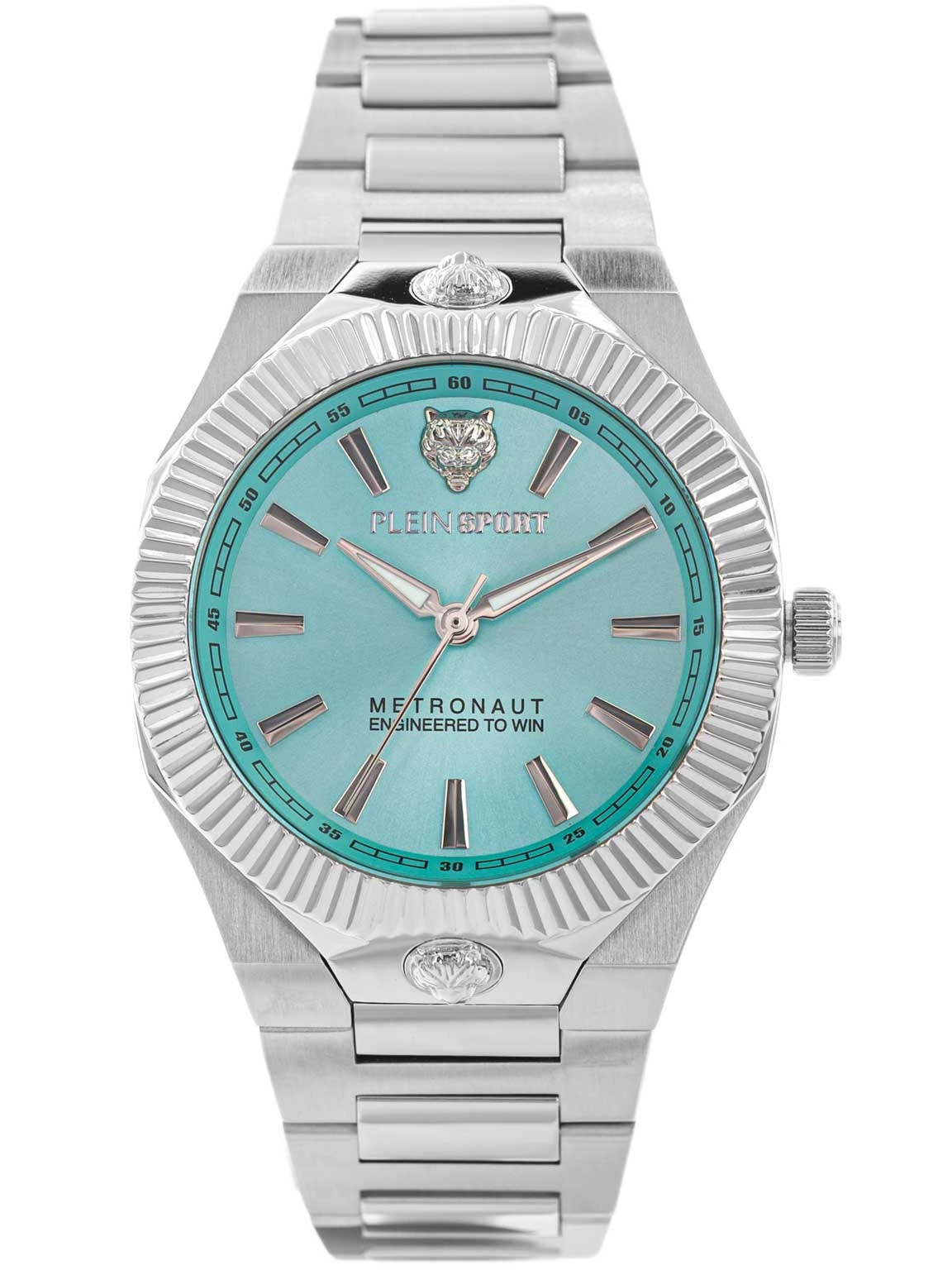 Zegarek damski Plein Sport PSDGA0725 Metronaut to propozycja dla kobiet, które cenią sobie nowoczesną elegancję w srebrnym wydaniu. To model, który od pierwszego spojrzenia zachwyca dopracowanym designem i wyważonym połączeniem klasyki z nowoczesnością. Srebrna koperta wykonana ze stali szlachetnej prezentuje się solidnie i szlachetnie, podkreślając luksusowy charakter zegarka. W duecie z dopasowaną bransoletą w tym samym odcieniu tworzy spójną, efektowną kompozycję, która świetnie wygląda zarówno na co dzień, jak i w bardziej eleganckich stylizacjach. Centralnym punktem zegarka jest lazurowy cyferblat, którego barwa subtelnie kontrastuje z chłodnym odcieniem srebra. Pionowe indeksy nadają mu czytelności, a delikatnie ryflowana koperta wokół tarczy wprowadza nutę oryginalności i dynamiki. Wskazówki pokryte powłoką Neobrite zapewniają widoczność po zmroku, wystarczy krótkie naświetlenie, by zegarek pozostał praktyczny o każdej porze dnia.