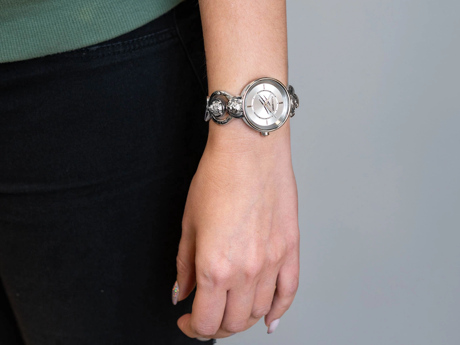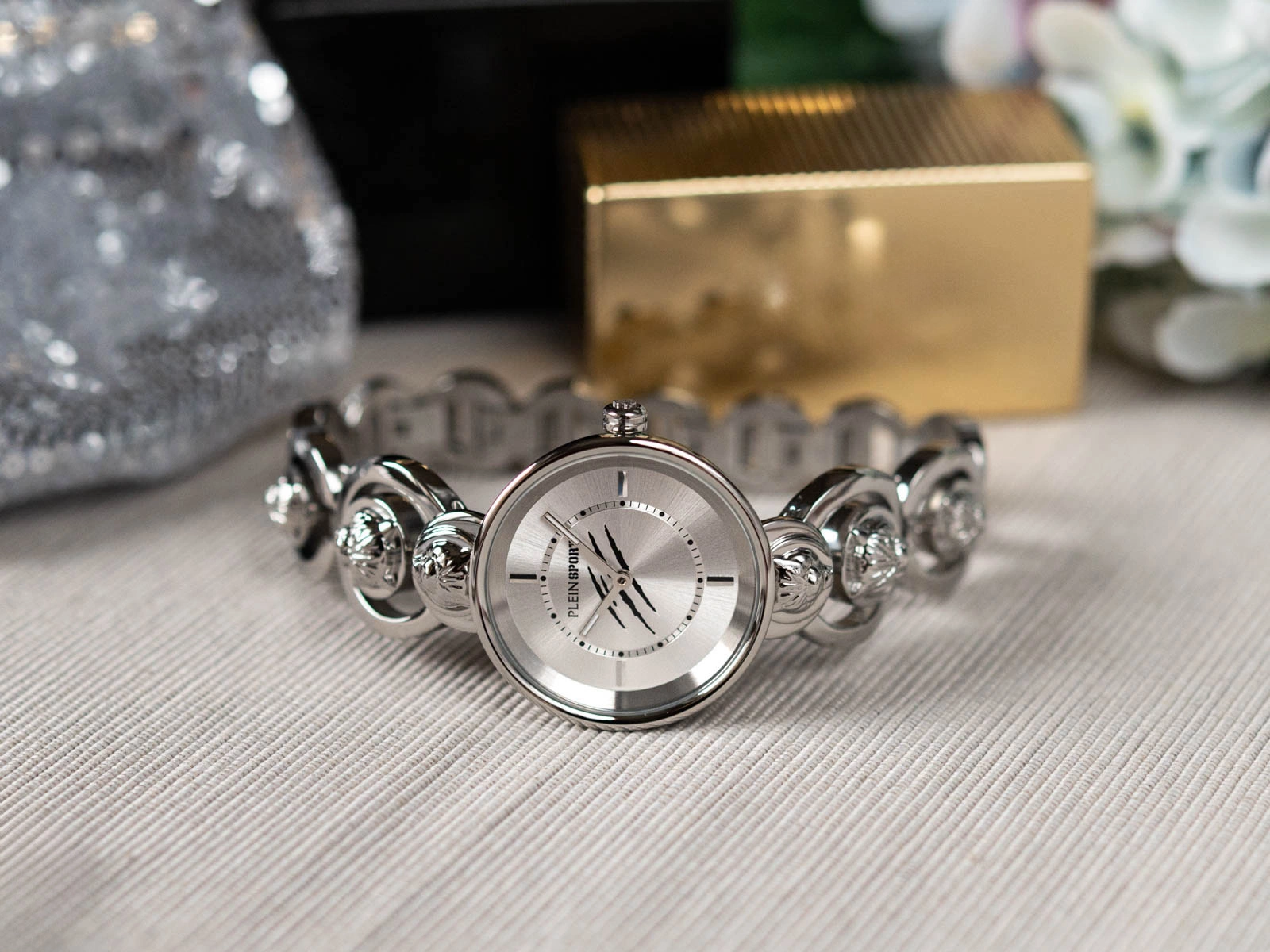 Zegarek damski Plein Sport PSLEA0424 Supernova to wyjątkowy dodatek dla kobiet, które lubią, gdy elegancja spotyka się z odwagą. Model ten emanuje nowoczesnym stylem i pewnością siebie, to propozycja dla pań, które chcą wyróżniać się w tłumie. Srebrna koperta ze stali szlachetnej nadaje całości luksusowego charakteru, a oryginalna bransoleta z ogniw w kształcie kół przyciąga wzrok niebanalną formą. Połączenie połyskujących powierzchni z delikatną linią koperty sprawia, że zegarek wygląda jednocześnie elegancko i nowocześnie. Na srebrnym cyferblacie uwagę przykuwa grafika przedstawiająca ślady pazurów tygrysa - motyw charakterystyczny dla marki Plein Sport, symbolizujący siłę i energię. Minimalistyczne wskazówki pokryte powłoką Neobrite umożliwiają wygodny odczyt godziny także po zmroku, zachowując przy tym nienaganny wygląd.