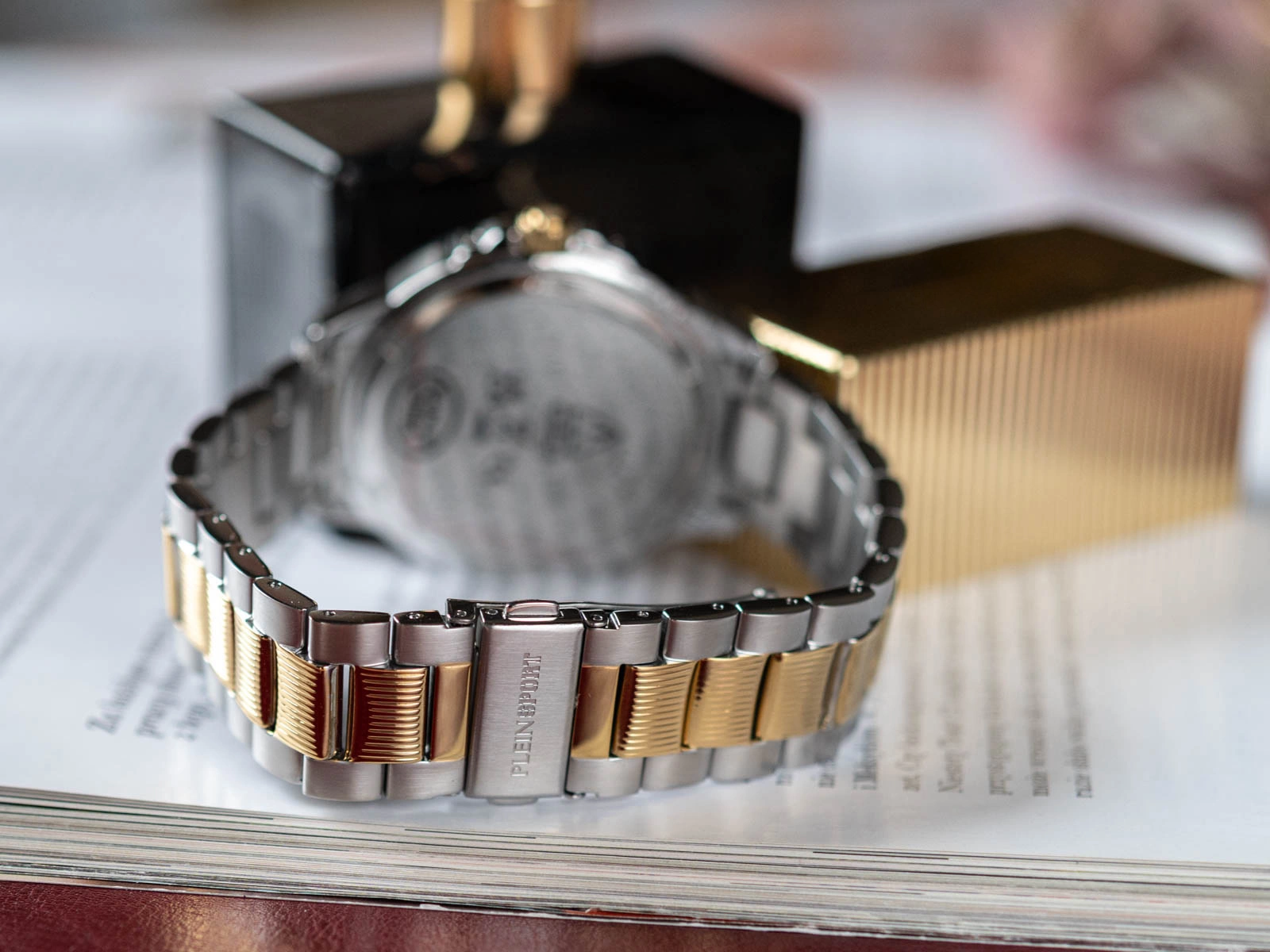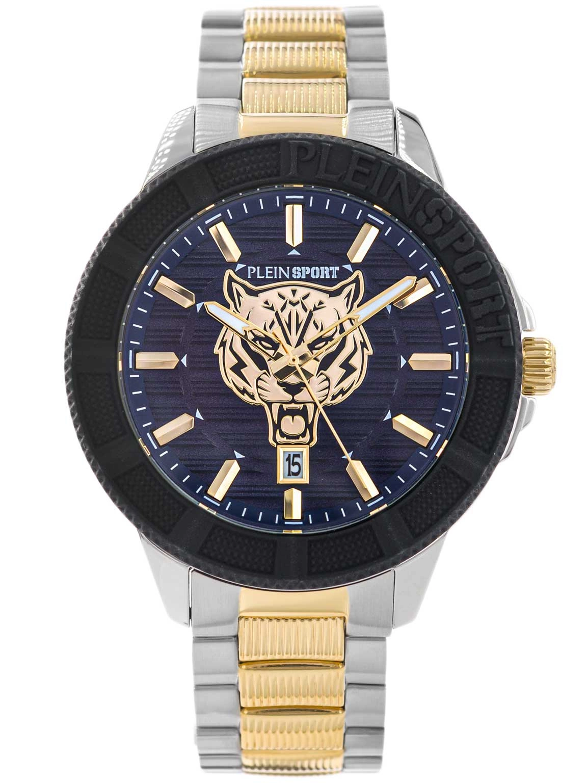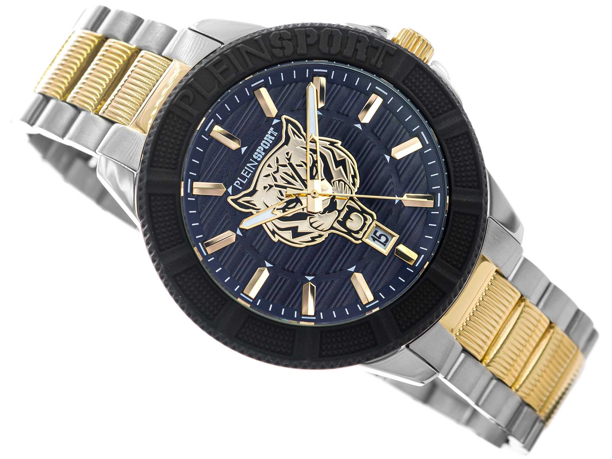 - Zegarek Męski Plein Sport PSAEA0824 srebrno-złoty na bransolecie. Posiada funkcję datownika i neobrite.