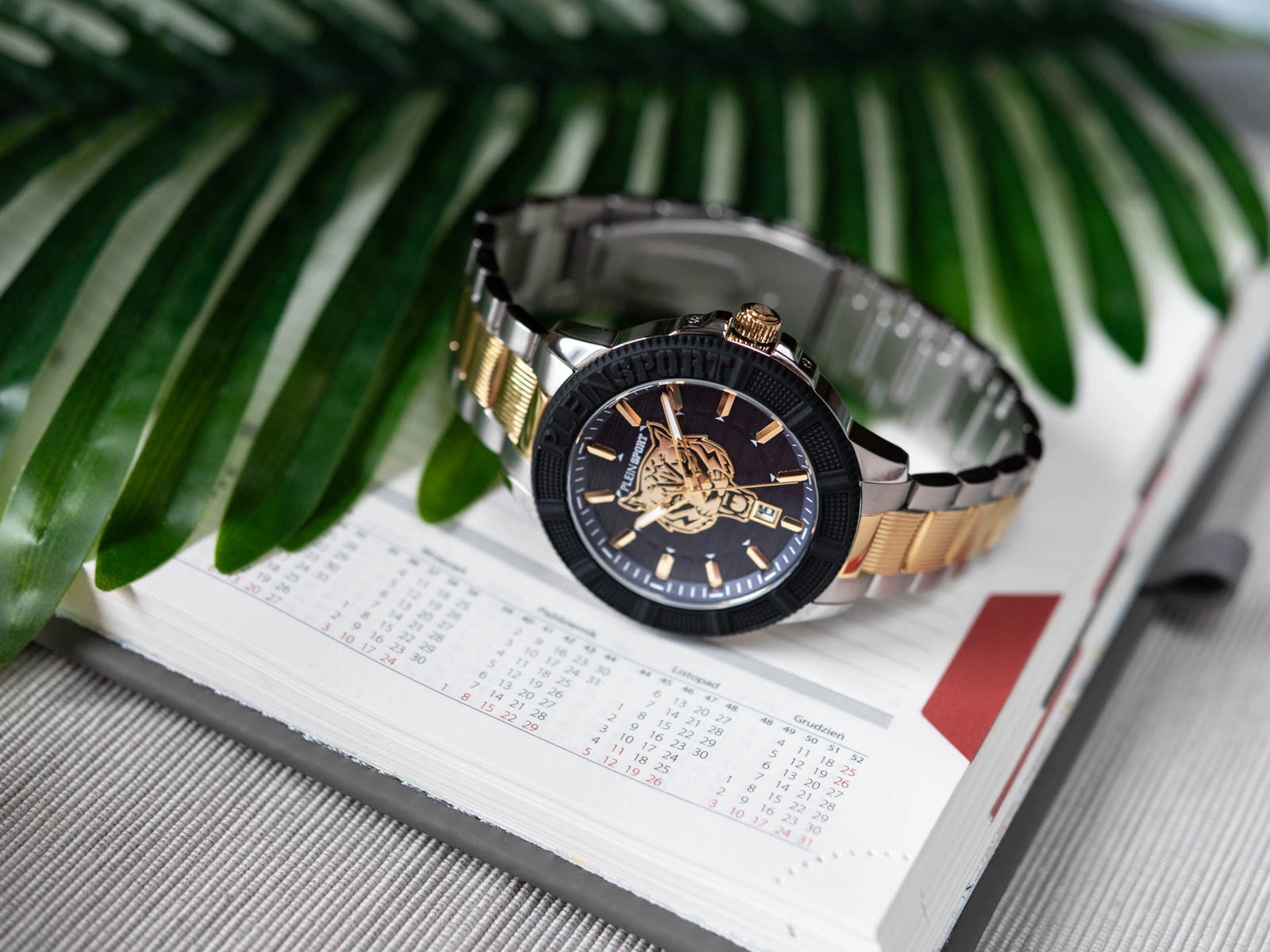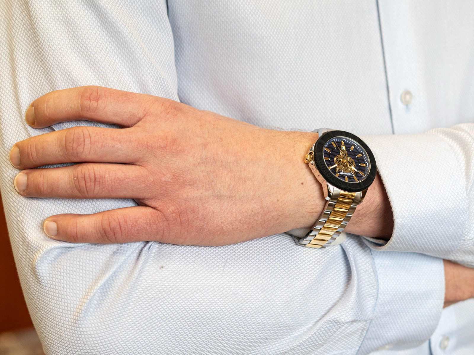 Zegarek Plein Sport PSAEA0824 City Rush to wyraz nowoczesnej miejskiej elegancji, w której siła stali spotyka się z wyrafinowaniem złota. Jego projekt łączy w sobie charakterystyczną dla marki Plein Sport energię z elegancją typową dla zegarków o bardziej klasycznym wyrazie. Koperta i bransoleta wykonane zostały z wysokiej jakości stali szlachetnej, której powierzchnia łączy chłodny połysk srebra z akcentami w kolorze złota. Całość uzupełnia czarny silikonowy bezel, wprowadzający sportową nutę i podkreślający dynamiczny charakter modelu. Bransoletę wyposażono w wygodne zapięcie motylkowe, które idealnie komponuje się z elegancką linią koperty. Granatowa tarcza przyciąga uwagę dużym złotym logo z głową tygrysa — symbolem siły, determinacji i niezależności. Proste, złote indeksy liniowe oraz smukłe wskazówki w odcieniach złota i bieli zapewniają doskonałą czytelność, a dzięki powłoce neobrite, która świeci po wcześniejszym naświetleniu, zegarek pozostaje funkcjonalny również w ciemności. Nad indeksem godziny szóstej umieszczono okno datownika, subtelnie wkomponowane w kompozycję cyferblatu. Model Plein Sport PSAEA0824 City Rush chroni płaskie szkło mineralne, odporne na codzienne zarysowania. Za jego precyzyjne działanie odpowiada niezawodny japoński mechanizm kwarcowy Citizen Miyota 2315, ceniony za trwałość i punktualność. Ten zegarek stanowi doskonałe połączenie miejskiego stylu z biżuteryjną elegancją — jest wyrazisty, ale nieprzesadzony, zaprojektowany dla osób, które cenią luksus w nowoczesnym wydaniu. W zestawie znajduje się oryginalne opakowanie producenta, które czyni go znakomitym wyborem na prezent.