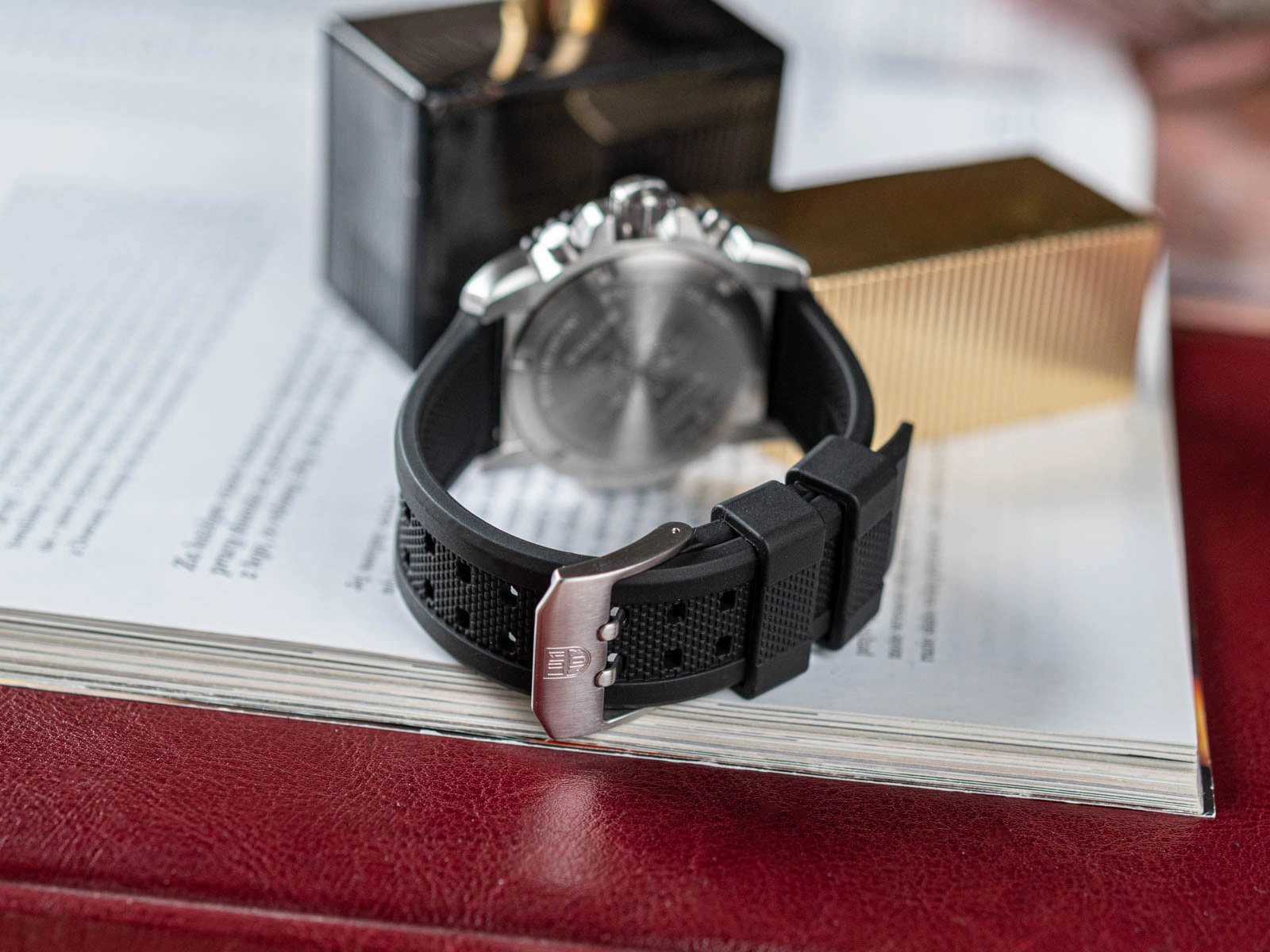 Czarna, analogowa tarcza z wyraźnymi, białymi indeksami i wskazówkami została przykryta utwardzanym szkłem mineralnym, które skutecznie chroni cyferblat przed zarysowaniami i uszkodzeniami mechanicznymi. Trzy subtarcze odpowiadają za funkcję chronografu. Jednokierunkowy obrotowy bezel z materiału Carbonox umożliwia dokładny pomiar minut w trakcie aktywności nurkowej. Datownik dni miesiąca umieszczony na wysokości godziny czwartej zapewnia wygodny dostęp do aktualnej daty. Mechanizm kwarcowy Ronda 5030.D Swiss Made napędza wszystkie funkcje zegarka, gwarantując precyzję i niezawodność. Wodoszczelność na poziomie 200 metrów, zakręcana koronka i zakręcany dekiel zapewniają pełną ochronę mechanizmu przed zalaniem w trakcie pływania, nurkowania czy w trudnych warunkach atmosferycznych. Bezel wykonany z lekkiego i niezwykle odpornego na uderzenia materiału Carbonox jest pięciokrotnie twardszy od stali, co zwiększa trwałość konstrukcji i bezpieczeństwo użytkowania pod wodą. Podświetlenie w systemie Luminox Light Technology (LLT) wykorzystuje mikrorurki wypełnione trytem, które emitują stały, jasny blask niezależnie od źródła zasilania. Dzięki temu wskazówki i indeksy pozostają czytelne w całkowitej ciemności, co jest kluczowe dla działań taktycznych i sportów ekstremalnych.