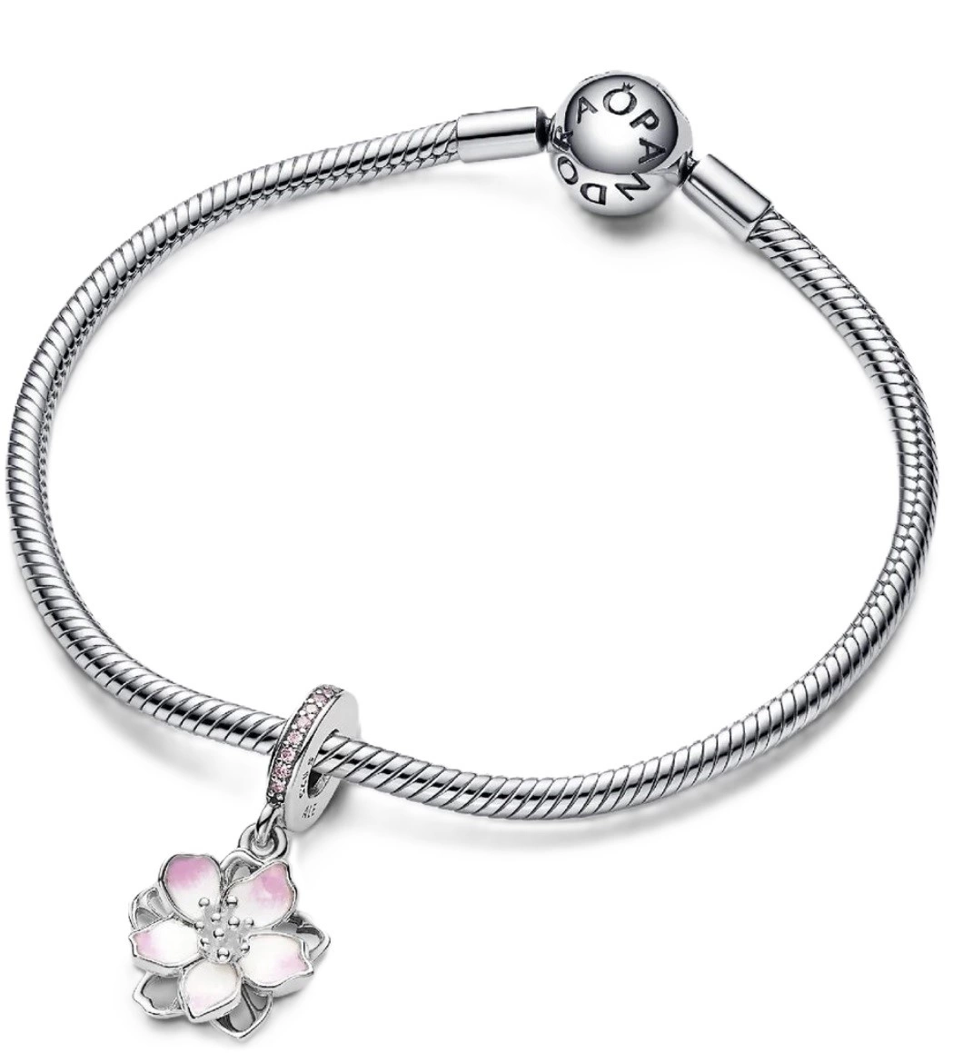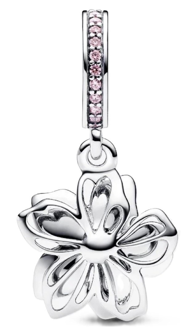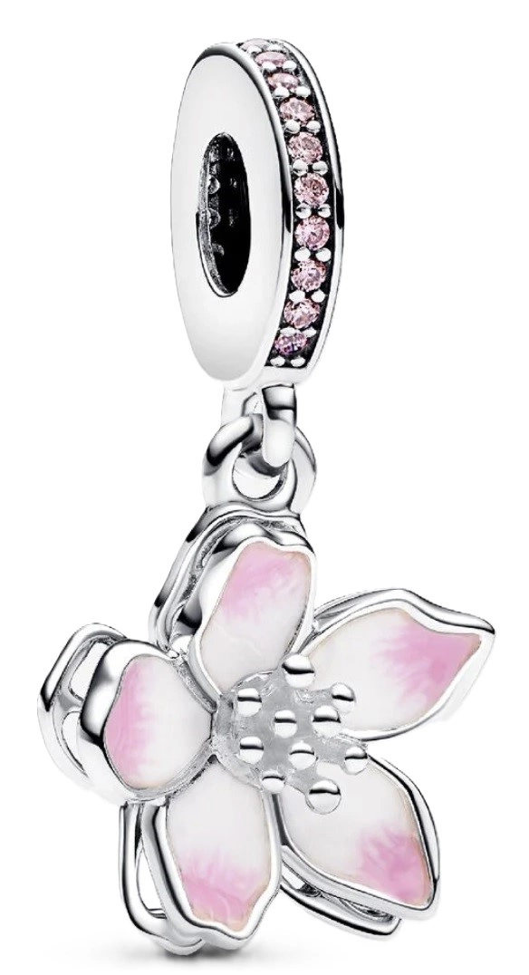 Charms Pandora Zawieszka Kwiat Wiśni 790667C01 to srebrna ozdoba, która prezentuje delikatność i świeżość wiosennych kwiatów. Misternie ukształtowane płatki kwiatu poruszają się przy każdym ruchu, jakby były muskane lekkim powiewem wiatru, a ręcznie nakładana różowo-biała emalia nadaje im subtelny, romantyczny odcień. Lśniące różowe cyrkonie sześcienne zdobią centrum kwiatu, wprowadzając dyskretny blask i podkreślając jego kobiecą elegancję. Ten charms stanowi wyjątkowy symbol odradzającej się natury i radości w codziennych stylizacjach Pandora Moments.