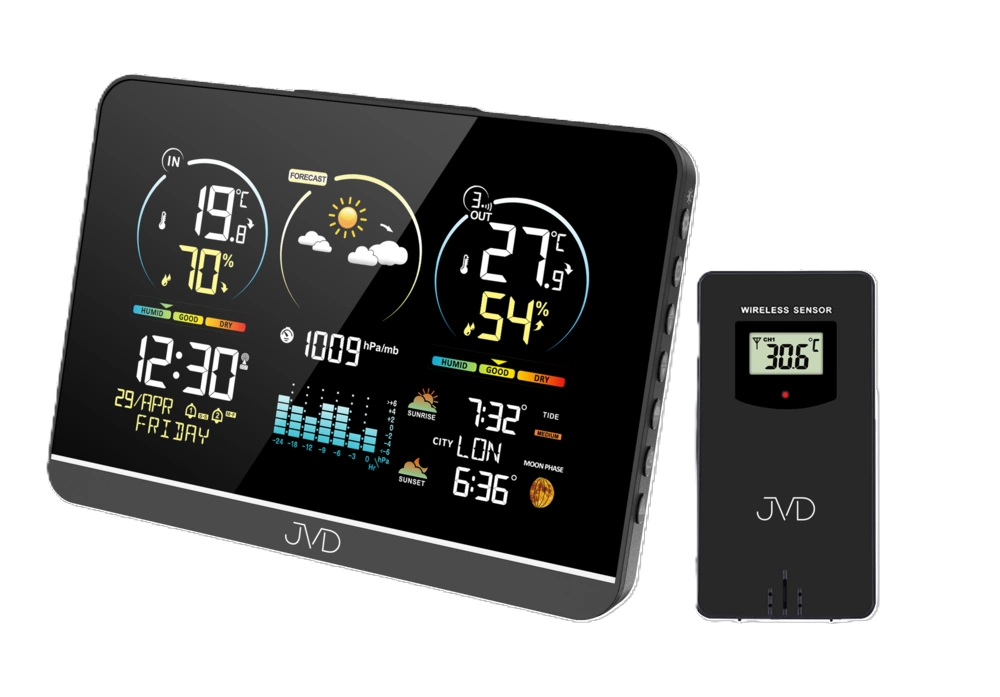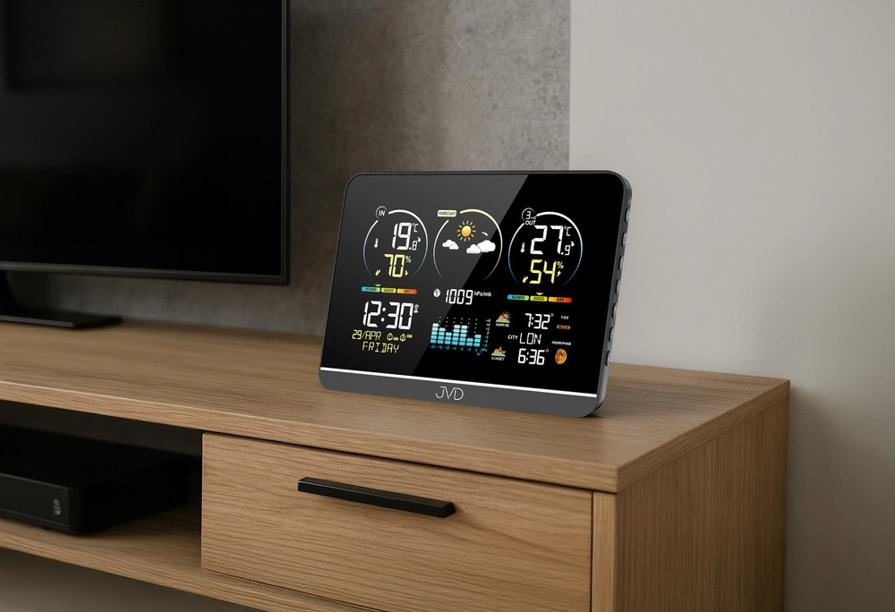Stacja Pogody JVD RB3408 to zaawansowane urządzenie meteorologiczne, które łączy wysoką precyzję pomiarów z estetycznym, nowoczesnym wzornictwem. Wykonana z trwałego tworzywa sztucznego, może być zarówno zawieszona na ścianie, jak i ustawiona na płaskiej powierzchni, dzięki czemu z łatwością dopasowuje się do każdego wnętrza. Przemyślany układ ekranu i podświetlanych segmentów LED zapewnia wyjątkową czytelność wskazań niezależnie od pory dnia, a czysta, harmonijna forma sprawia, że stacja stanowi atrakcyjny element nowoczesnej przestrzeni mieszkalnej lub biurowej. Serce urządzenia stanowi precyzyjny mechanizm kwarcowy sterowany falą radiową DCF77, który automatycznie synchronizuje czas z zegarem atomowym. Dzięki temu pomiar godzin jest zawsze dokładny, a użytkownik ma pewność, że urządzenie samo koryguje zmiany związane z przejściem na czas letni lub zimowy. JVD RB3408 pozwala na wyświetlanie godziny w formacie 12- lub 24-godzinnym oraz prezentuje pełny kalendarz z dniem tygodnia (w ośmiu językach, w tym w języku polskim), miesiącem i datą.