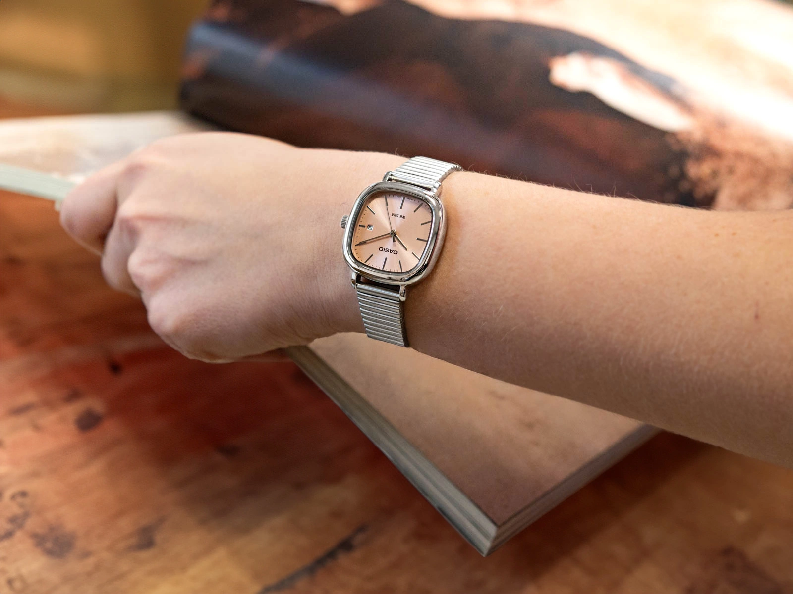 CASIO LTP-B166D-4AVEF to wyjątkowe zestawienie subtelnej elegancji i kobiecego wdzięku, stworzone dla pań, które cenią szyk w delikatnej formie. Smukła, zaokrąglona koperta dodaje modelowi lekkości, a jego klasyczna linia bez trudu odnajduje się zarówno w tradycyjnych, jak i nowoczesnych trendach. Tarcza w odcieniu różowego złota zachwyca prostotą i eleganckim blaskiem. Jej minimalistyczny charakter przełamuje niewielki datownik, który w dyskretny sposób informuje o aktualnym dniu miesiąca. Całość została zabezpieczona trwałym szkłem mineralnym, odpornym na zarysowania, zapewniającym długotrwały połysk oraz ochronę przed codziennym użytkowaniem.