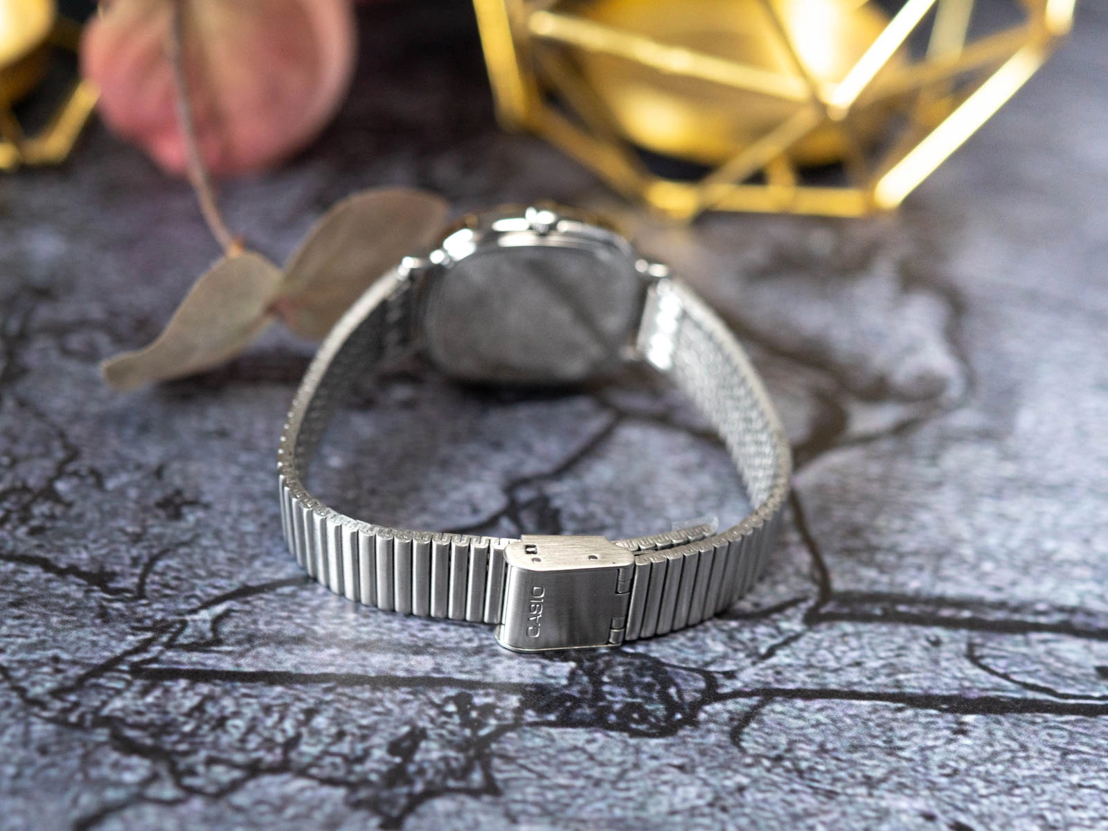 Model CASIO LTP-B166D-7AVEF to harmonijne połączenie kobiecego wdzięku i subtelnej elegancji, stworzony z myślą o kobietach, które cenią klasykę w delikatnym wydaniu. Klasyczna forma koperty, lekko zaokrąglona i smukła, nadaje zegarkowi niezwykłej lekkości, jednocześnie doskonale wpisując się zarówno w ponadczasowe, jak i nowoczesne trendy. Utrzymana w srebrnym odcieniu tarcza urzeka prostotą oraz dyskretnym blaskiem. Jej oszczędny design przełamano subtelnym datownikiem, który w nienachalny sposób informuje o aktualnym dniu miesiąca. Całość chroni wytrzymałe szkło mineralne odporne na zarysowania i gwarantujące trwały połysk podczas codziennego użytkowania.