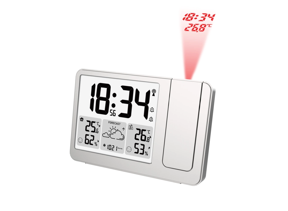 Stacja pogody JVD RB3539 to nowoczesne urządzenie meteorologiczne, które łączy precyzyjne pomiary z funkcją projektora, oferując kompleksowy przegląd warunków atmosferycznych. Jej srebrna, matowa obudowa z tworzywa sztucznego nadaje stacji elegancki, minimalistyczny charakter, dzięki czemu harmonijnie wpisuje się w każde wnętrze, od biura po salon czy sypialnię. Wyświetlacz jest podświetlany i można regulować jego jasność ręcznie lub automatycznie za pomocą wbudowanego czujnika natężenia światła, co zapewnia wygodny odczyt danych w różnych warunkach oświetleniowych. Urządzenie umożliwia prognozowanie pogody na najbliższe 12 godzin dzięki czujnikowi barometrycznemu. Prognoza pogody wyświetlana jest za pomocą sześciu ikon wskazujących warunki takie jak słońce, częściowe zachmurzenie, pochmurno, deszcz, możliwe burze oraz śnieg. Stacja mierzy również temperaturę i wilgotność powietrza – zarówno wewnątrz, jak i na zewnątrz pomieszczeń – z zakresami odpowiednio od -9,9 do +50°C wewnętrznie i od -40 do +70°C zewnętrznie oraz od 20 do 95% wilgotności powietrza. Stacja zapamiętuje najwyższe i najniższe wartości zarejestrowane w ciągu doby, co umożliwia śledzenie zmian w czasie. Dodatkowo aktywowane jest ostrzeżenie o oblodzeniu, gdy temperatura zewnętrzna spada do zakresu od -1 do +3°C. Wskaźnik komfortu powietrza pozwala szybko ocenić warunki wewnętrzne pod kątem przyjazności dla domowników.