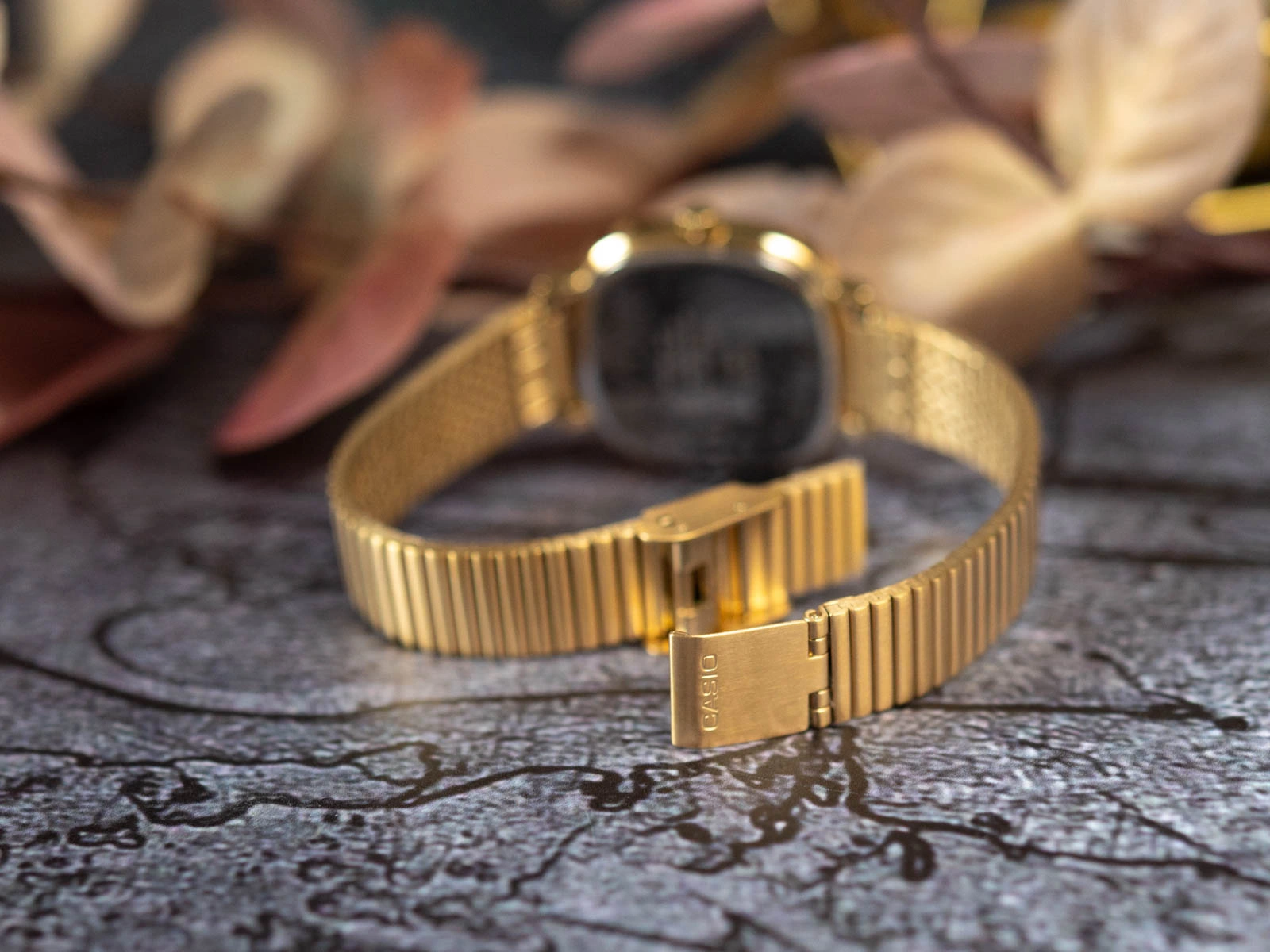 - Wodoszczelny Zegarek Damski Casio CASIO LTP-B166G 9AV złoty na bransolecie, posiada funkcje datownika