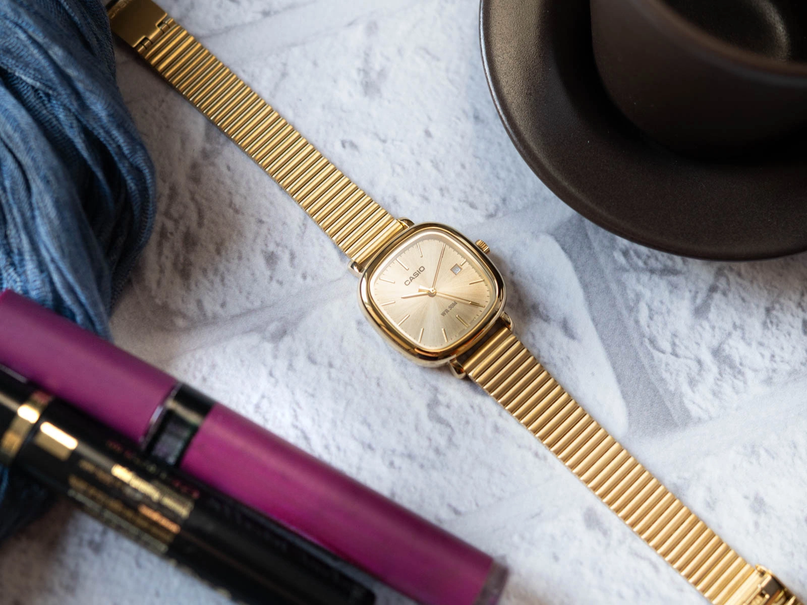 Zegarek CASIO LTP-B166G-9AVEF to elegancja w najczystszej formie, zamknięta w szlachetnym odcieniu złota. Smukła, delikatnie zaokrąglona koperta sprawia, że czasomierz prezentuje się wyjątkowo subtelnie, zachowując przy tym ponadczasowy styl, który bez trudu wpisuje się zarówno w klasyczne, jak i współczesne kanony mody. Złota tarcza zachwyca minimalistycznym charakterem i delikatnym połyskiem. Jej prostota została przełamana elegancko wkomponowanym datownikiem, który w dyskretny sposób informuje o aktualnym dniu miesiąca. Tarcza chroniona jest szkłem mineralnym odpornym na zarysowania, trwałym i zapewniającym niezmienny blask podczas codziennego użytkowania. Lekkość konstrukcji sprawia, że zegarek doskonale układa się na nadgarstku, podkreślając styl noszącej go osoby, nie przytłaczając jej. Wewnątrz pracuje niezawodny mechanizm kwarcowy, ceniony za japońską precyzję, wytrzymałość i długotrwałą dokładność działania, niewymagającą częstego ustawiania.