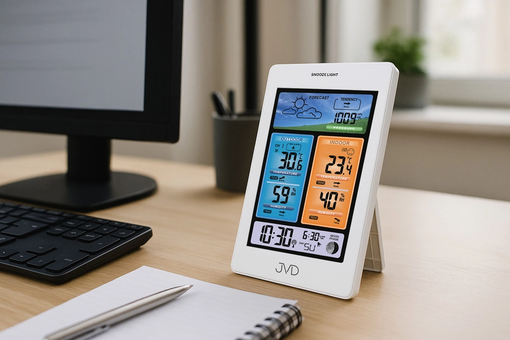 Stacja pogody JVD RB3374 to urządzenie, które łączy w sobie nowoczesną technologię pomiarową z subtelnym, minimalistycznym wzornictwem. Jej biała, matowa obudowa o delikatnie zaokrąglonych krawędziach wprowadza do wnętrza wrażenie czystości i harmonii, a duży, podświetlany wyświetlacz o czytelnym układzie pozwala błyskawicznie odczytać wszystkie potrzebne dane. Stonowana kolorystyka i wyważone proporcje czynią z niej elegancki element biura, sypialni lub salonu, który nie tylko informuje o zmianach pogody, ale także dopełnia estetykę przestrzeni. Model RB3374 opiera się na precyzyjnym czujniku barometrycznym, który umożliwia stworzenie krótkoterminowej prognozy pogody na najbliższe 12 godzin. Zmiany ciśnienia atmosferycznego są interpretowane i prezentowane za pomocą sześciu czytelnych ikon – od słonecznego nieba, przez częściowe zachmurzenie i opady, aż po śnieg. Urządzenie mierzy temperaturę i wilgotność zarówno wewnątrz, jak i na zewnątrz pomieszczenia, dostarczając danych w szerokim zakresie pomiarowym. Wyniki są aktualizowane w czasie rzeczywistym, a wbudowana pamięć zapisuje wartości maksymalne i minimalne, co pozwala śledzić dobowe zmiany warunków otoczenia.