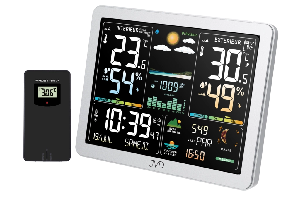 W centrum funkcji Stacji pogodowej JVD RB3568 znajduje się mechanizm kwarcowy sterowany falą radiową (DCF77), który automatycznie synchronizuje się z zegarem atomowym, gwarantując perfekcyjną dokładność wskazań czasu. Zegar może pracować w formacie 12- lub 24-godzinnym, a rozbudowany kalendarz automatycznie dostosowuje daty, uwzględniając lata przestępne. Dni tygodnia wyświetlane są w jednym z ośmiu języków, w tym w języku polskim. Stacja prognozuje pogodę na najbliższe 12 godzin za pomocą czujnika barometrycznego, prezentując wyniki w postaci sześciu ikon symbolizujących aktualne i nadchodzące warunki atmosferyczne – od bezchmurnego nieba po opady i śnieg. Barometr o zakresie 600–1100 hPa rejestruje zmiany ciśnienia w układzie dobowym, a wykres trendu pozwala śledzić dynamikę pogody z naukową dokładnością. Wbudowany termometr i higrometr mierzą zarówno temperaturę, jak i wilgotność wewnętrzną i zewnętrzną, korzystając z bezprzewodowego czujnika o zasięgu do 60 metrów, działającego na częstotliwości 433,92 MHz. Zakres pomiaru temperatury obejmuje od -40°C do +70°C na zewnątrz i od -9,9°C do +50°C wewnątrz pomieszczeń, natomiast wilgotność rejestrowana jest w przedziale 20–95%, z dokładnością do 1%.