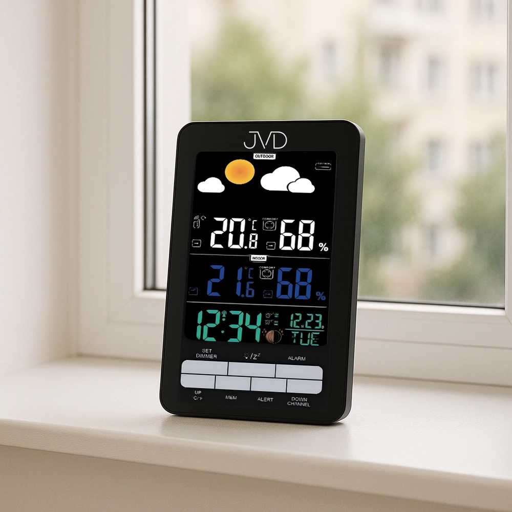 Stacja pogody JVD RB6687.1 to nowoczesne urządzenie, które w elegancki sposób łączy precyzję pomiarów meteorologicznych z funkcjonalnością codziennego użytku. Jej kompaktowa, matowo czarna obudowa z subtelną srebrną ramką podkreśla techniczny charakter, a jednocześnie doskonale komponuje się z wnętrzami o współczesnym, minimalistycznym wystroju. Czytelny, podświetlany wyświetlacz LED o zrównoważonym kontraście i czystym układzie informacji zapewnia wygodny odczyt zarówno w ciągu dnia, jak i w nocy. Centralnym elementem RB6687.1 jest mechanizm kwarcowy sterowany falą radiową (DCF77), który automatycznie synchronizuje wskazania z zegarem atomowym, eliminując konieczność ręcznego korygowania czasu. Zegar może pracować w formacie 12- lub 24-godzinnym, a wbudowany kalendarz automatyczny uwzględnia lata przestępne, zachowując pełną dokładność bez względu na upływ czasu.
