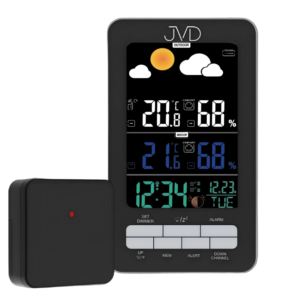 • Stacja pogody JVD RB6687.1 - czarny. Posiada funkcję radio control, alarm, zegar, kalendarz, higrometr