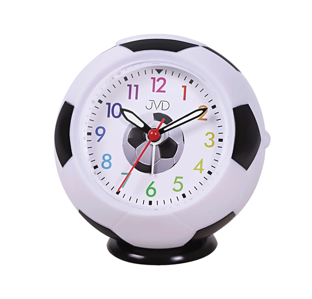 • Budzik JVD SRP9001.1 - czarno biały. W kształcie piłki, dziecięcy. Podświetlenie, neobrite, cichy mechanizm