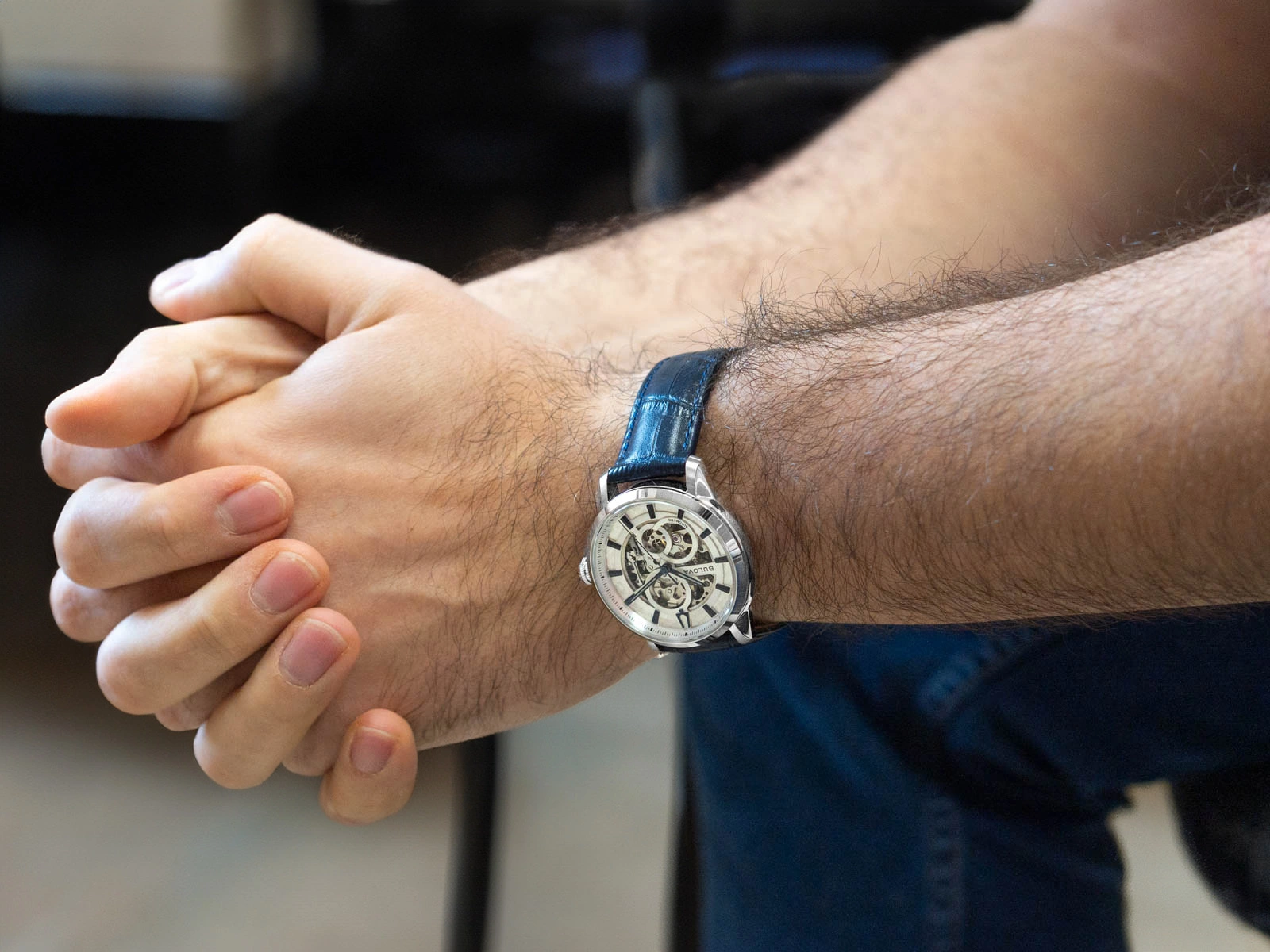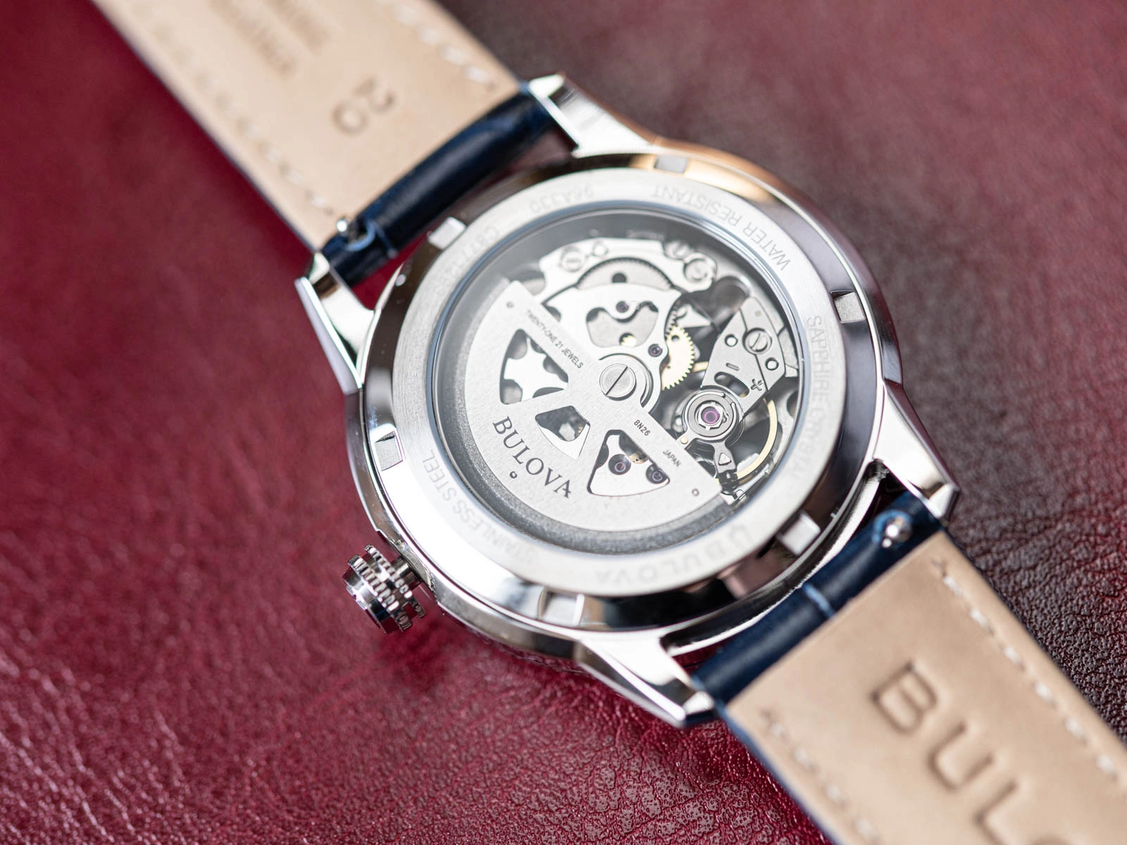 Bulova 96A330 Sutton to zegarek, który łączy w sobie klasyczną elegancję z nowoczesnym spojrzeniem na sztukę zegarmistrzowską. Projektanci marki Bulova stworzyli model, który zachwyca nie tylko dopracowaną formą, ale również odsłania fascynujące wnętrze swojego mechanizmu. Koperta wykonana z wysokiej jakości stali szlachetnej w odcieniu srebra przyciąga uwagę subtelnym połyskiem i kunsztownym wykończeniem. Zestawienie powierzchni polerowanych i szczotkowanych nadaje jej głębi oraz eleganckiego charakteru. Uzupełnia ją granatowy pasek z naturalnej skóry, który nie tylko podkreśla kolorystykę modelu, ale także zapewnia komfort noszenia i doskonałe dopasowanie do nadgarstka. Centralnym punktem zegarka jest transparentna tarcza typu skeleton, odsłaniająca złożoną strukturę mechanizmu. Każdy detal, od delikatnych mostków, przez precyzyjnie wykonane koła zębate, po rytmiczny balans tworzy niezwykłą kompozycję. W jej sercu pracuje japoński mechanizm automatyczny, osadzony na 21 kamieniach łożyskowych. Przeszklony dekiel pozwala podziwiać ruch mechanizmu również od spodu, podkreślając dbałość o każdy detal konstrukcji.