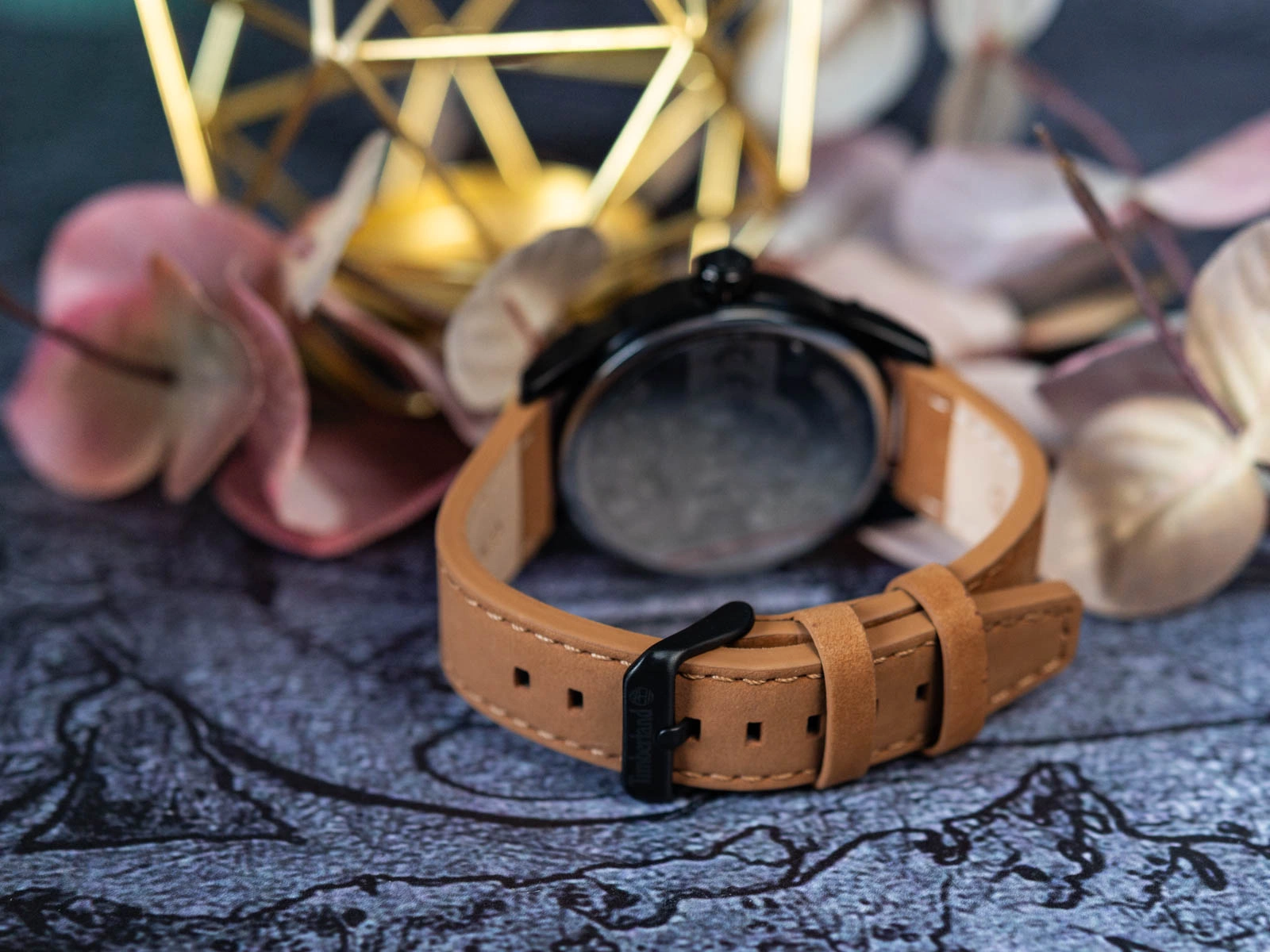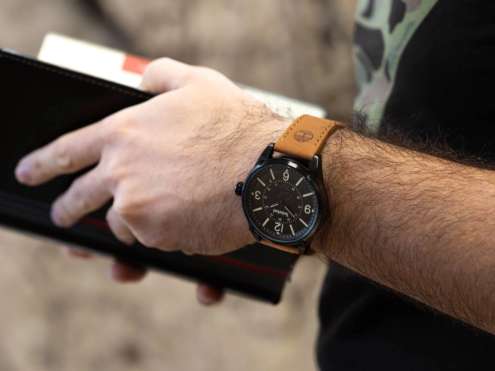 Timberland TDWGA9000602 to zegarek męski, w którym minimalistyczna elegancja łączy się z wyrazistym charakterem. Czarne wykończenie koperty współgra z głęboką czarną tarczą, tworząc spójną i nowoczesną całość. Beżowe indeksy liniowe subtelnie kontrastują z tłem, a cyfry arabskie na godzinach 12, 3, 6 i 9 nadają kompozycji przejrzystości i wyraźnego rytmu wizualnego. Płaskie szkło mineralne chroni tarczę, zachowując jej klarowność i elegancki wygląd. Brązowy pasek ze skóry naturalnej wprowadza ciepły akcent i tradycyjny element rzemiosła, zapewniając komfort noszenia. Mechanizm kwarcowy gwarantuje precyzyjne odmierzanie czasu, a całość harmonijnie komponuje się z codziennymi i bardziej formalnymi stylizacjami. Model oferowany jest w gustownym pudełku, co czyni go praktycznym i eleganckim prezentem.