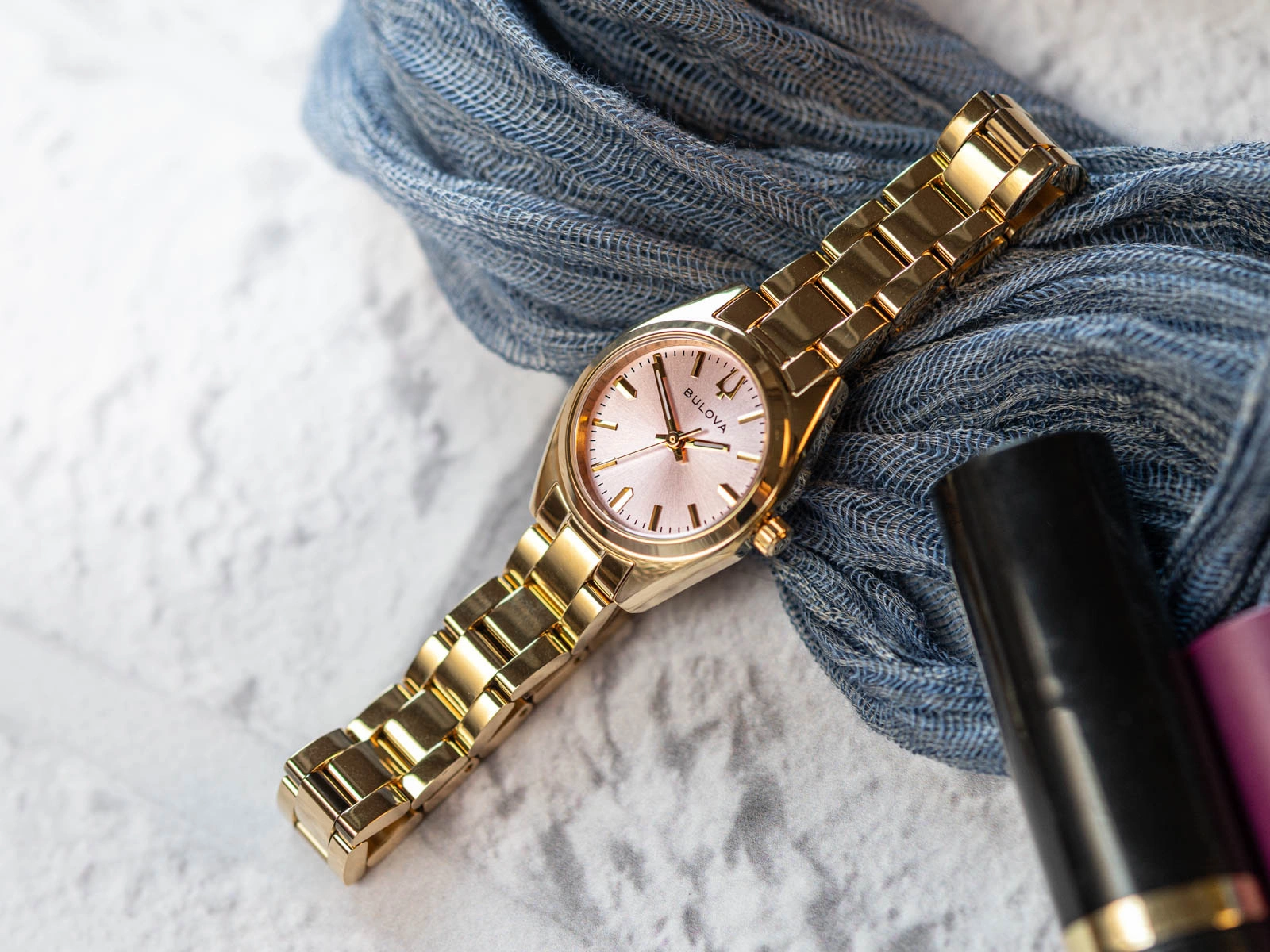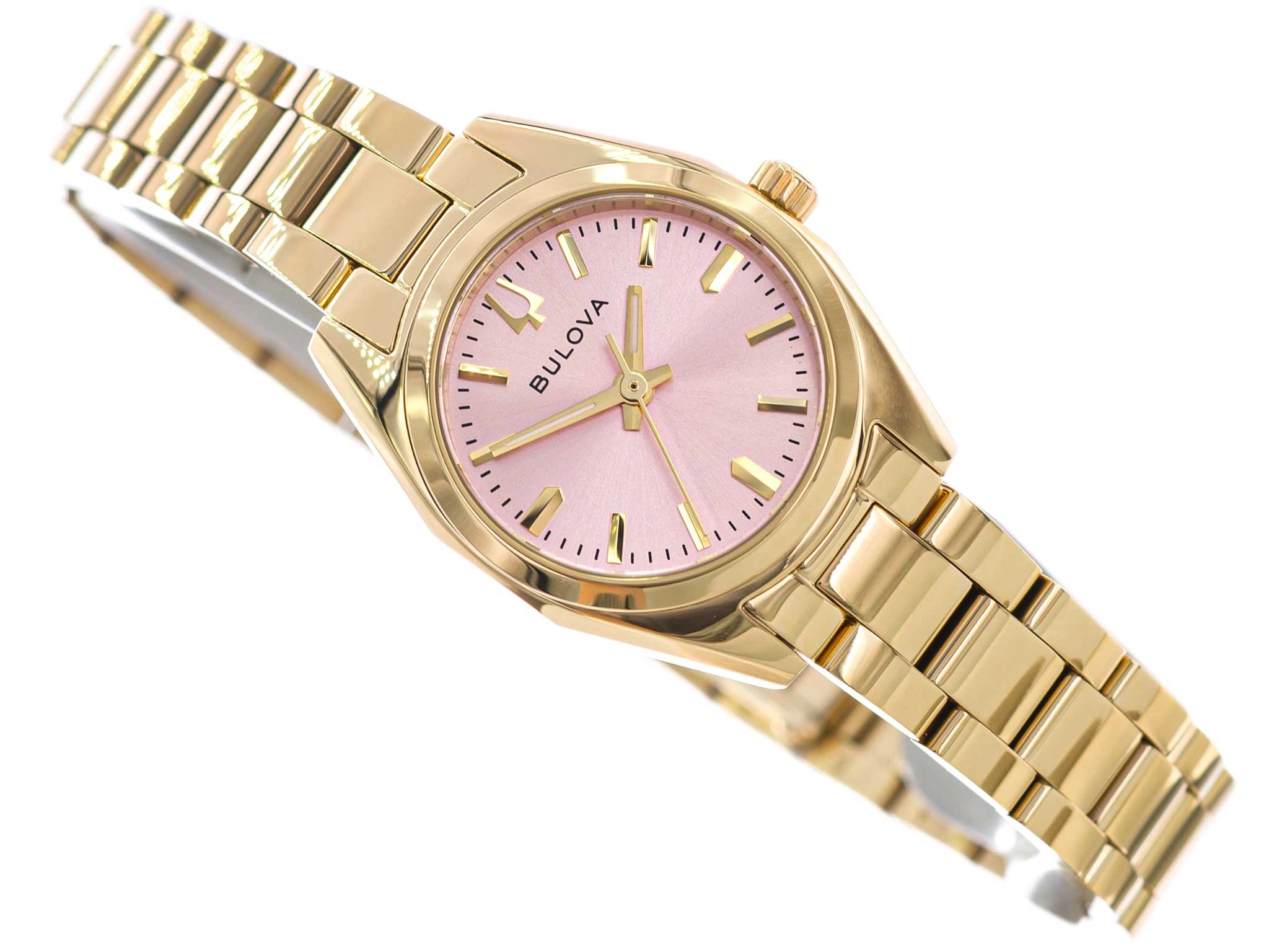 Bulova 97L187 Surveyor to wyjątkowy damski zegarek utrzymany w klasycznej, złotej kolorystyce. Zachwyca prostotą formy, ponadczasowym stylem oraz wysoką jakością wykonania. Błyszcząca koperta w kolorze złotym została wykonana z wysokiej jakości stali szlachetnej, gwarantującej trwałość i elegancki wygląd przez długie lata. W jej wnętrzu pracuje precyzyjny, japoński mechanizm kwarcowy zasilany baterią, zapewniający niezawodność i dokładność pomiaru czasu. Centralnym punktem modelu jest subtelna, różowa tarcza, która pięknie kontrastuje ze złotymi wskazówkami. Dla lepszej widoczności po zmroku, wskazówki zostały pokryte fosforyzującą powłoką Neobrite, która po naświetleniu świeci w ciemności. Zamiast indeksu godziny 12 umieszczono eleganckie logo producenta. Tarcza chroniona jest przez odporne na zarysowania szkło szafirowe.