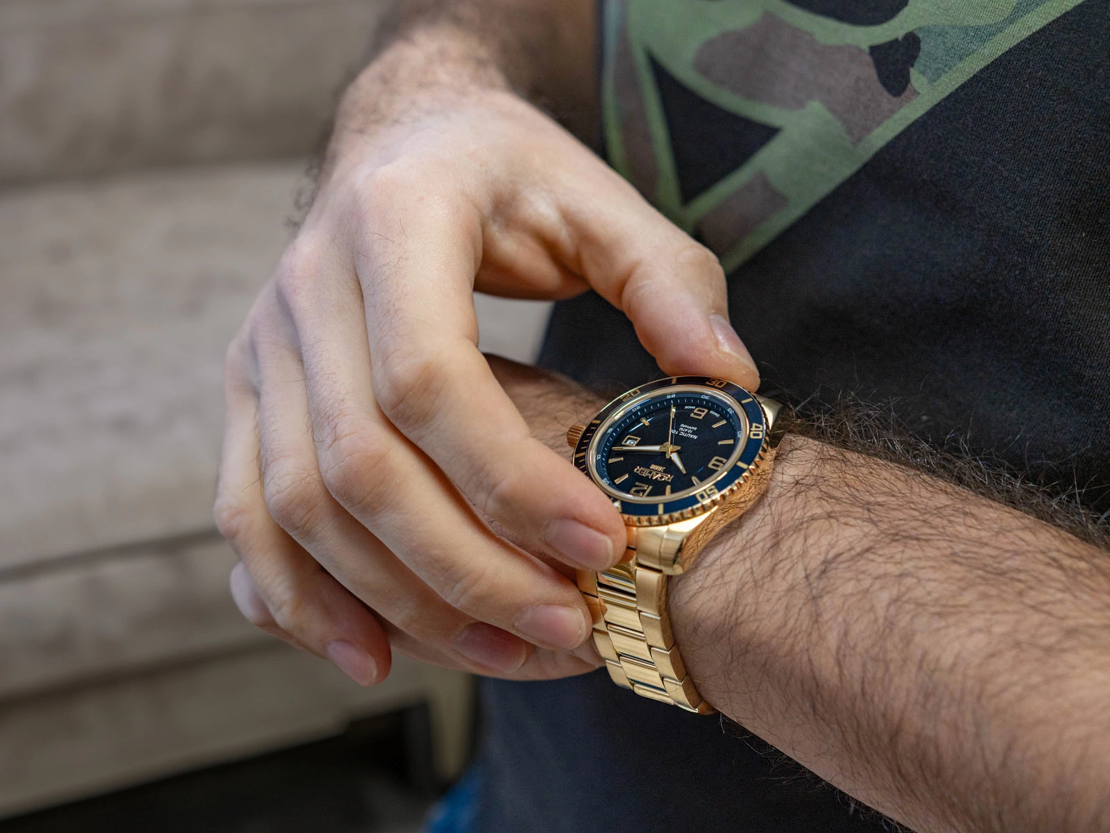 - Wodoszczelny Zegarek Męski Roamer 862844 48 45 20 złoty na bransolecie, posiada funkcję datownika.