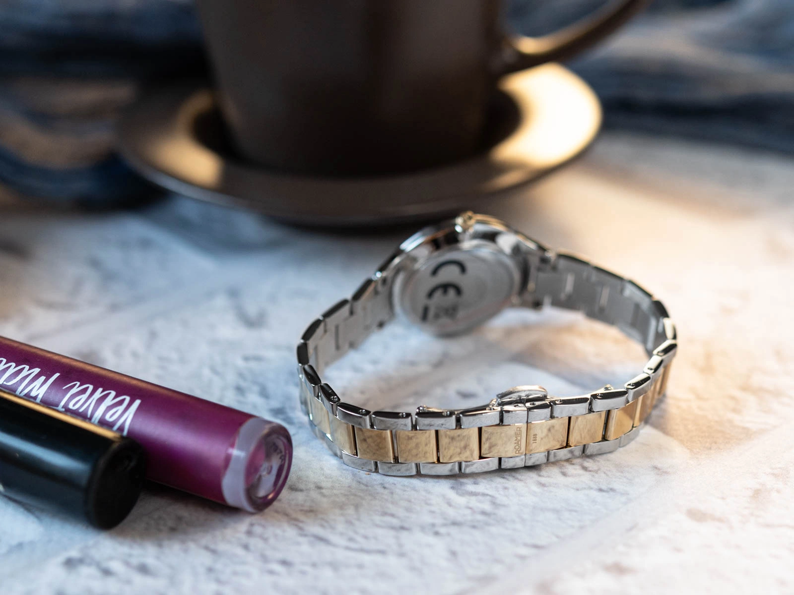 Roamer 863857 47 55 50 Eternal to zegarek damski, który łączy klasyczną elegancję z wyrafinowanym, biżuteryjnym stylem charakterystycznym dla szwajcarskiego zegarmistrzostwa. Należący do kolekcji Eternal, stanowi przykład harmonii pomiędzy subtelną estetyką a techniczną precyzją wykonania. Koperta wykonana ze stali szlachetnej pokryta powłoką w kolorze srebra tworzy elegancką oprawę dla czarnej tarczy o wykończeniu typu sunburst, której powierzchnia delikatnie załamuje światło, odsłaniając głębię koloru i subtelne refleksy. Złote wskazówki oraz smukłe indeksy podkreślają klasyczny charakter kompozycji, a drobne cyrkonie rozmieszczone na pozycjach godzin 12, 3, 6 i 9 dodają całości blasku i kobiecej finezji. Model chroniony jest przez szkło szafirowe o wysokiej odporności na zarysowania, uzupełnione powłoką antyrefleksyjną, która zapewnia doskonałą czytelność tarczy w różnych warunkach oświetleniowych. Zegarek napędzany jest szwajcarskim mechanizmem kwarcowym Ronda 762, znanym z precyzyjnego i bezobsługowego działania. Bransoleta wykonana ze stali szlachetnej utrzymana jest w modnej srebrno-złotej tonacji, z drobnym połyskiem i gładkim wykończeniem ogniw. Zapięcie motylkowe gwarantuje wygodę i bezpieczeństwo użytkowania, pozostając niewidoczne podczas noszenia. Roamer 863857 47 55 50 Eternal to zegarek, który łączy w sobie precyzję i luksus, oferując elegancję w jej najczystszej formie — bez zbędnych dodatków, z naciskiem na perfekcję detalu i szlachetność materiałów. Każdy model dostarczany jest w eleganckim, oryginalnym pudełku marki Roamer.