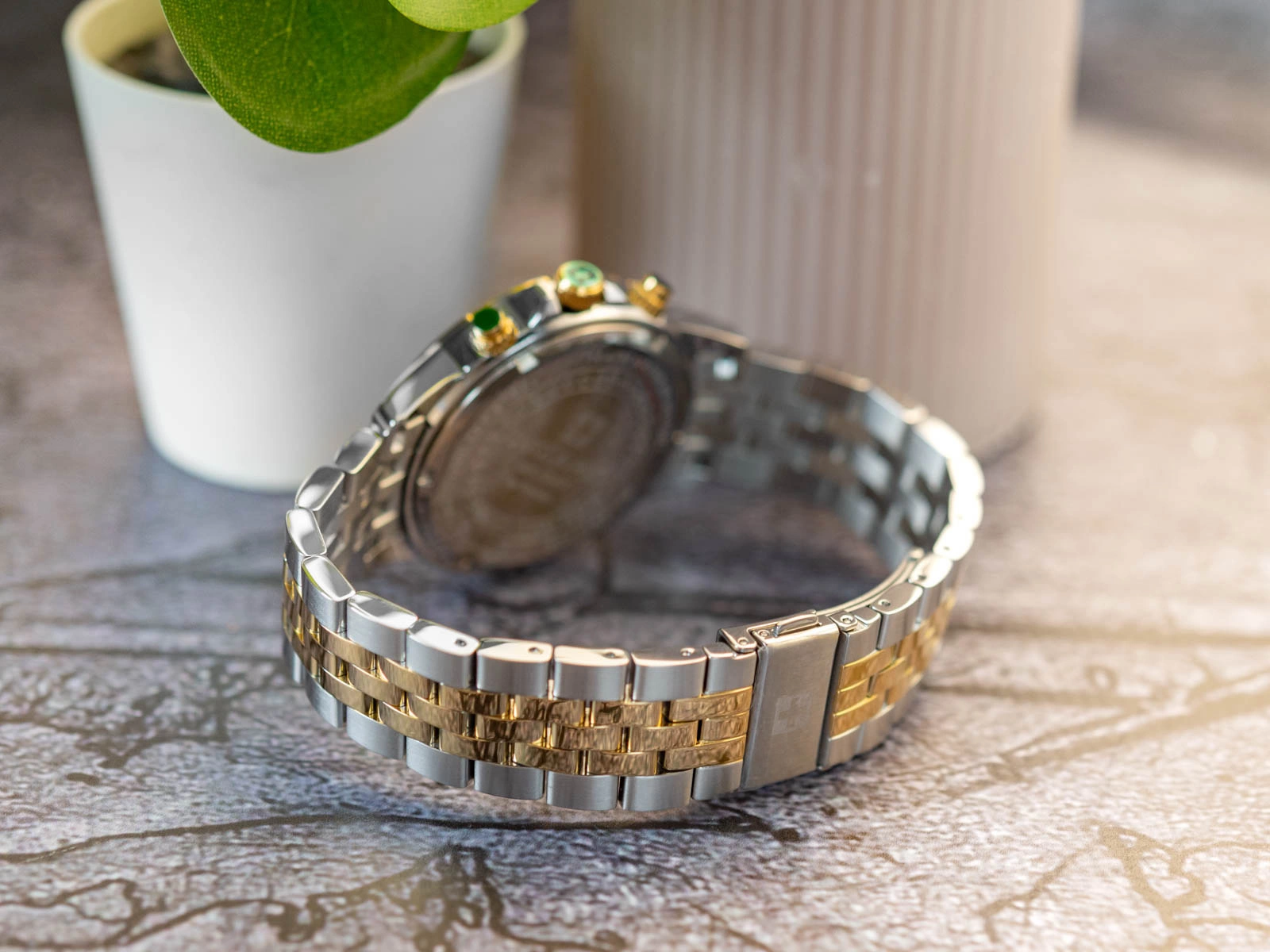 Swiss Alpine Military SAM7024.9144 to zegarek, który łączy klasyczną elegancję ze świeżym, naturalnym charakterem, podkreślonym głębokim zielonym odcieniem tarczy. Koperta ze stali szlachetnej emanuje subtelnym blaskiem, a złoty bezel tworzy harmonijny kontrast, nadając całości wyrafinowanego wyrazu. Tarcza w intensywnej zieleni stanowi eleganckie tło dla wskazówek i indeksów w odcieniach złota i bieli, pokrytych powłoką luminescencyjną neobrite, która pozwala na odczyt czasu po wcześniejszym naświetleniu, także w słabszym świetle. Subtarcze chronografu, rozmieszczone w harmonijnym układzie, wprowadzają element dynamiki, zachowując równocześnie minimalistyczną estetykę tarczy. Dyskretnie wkomponowane okienko datownika przy godzinie czwartej łączy funkcjonalność z elegancją, nie zaburzając spójności kompozycji. Precyzyjny mechanizm kwarcowy gwarantuje niezawodny i dokładny chód, a solidna konstrukcja zegarka zapewnia trwałość na lata. Bransoleta w srebrno-złotym zestawieniu współgra z zieloną tarczą i złotym bezelem, łącząc luksusowy charakter z komfortem noszenia dzięki segmentowej budowie i zapięciu motylkowemu. Płaskie szkło mineralne chroni cyferblat przed zarysowaniami, a wodoszczelność do 10 ATM pozwala na bezpieczne użytkowanie podczas pływania i codziennych aktywności. Swiss Alpine Military SAM7024.9144 emanuje świeżością i uniwersalnością, oferując elegancję i funkcjonalność, które sprawdzają się w każdej sytuacji, od codziennych zadań po bardziej formalne okazje.