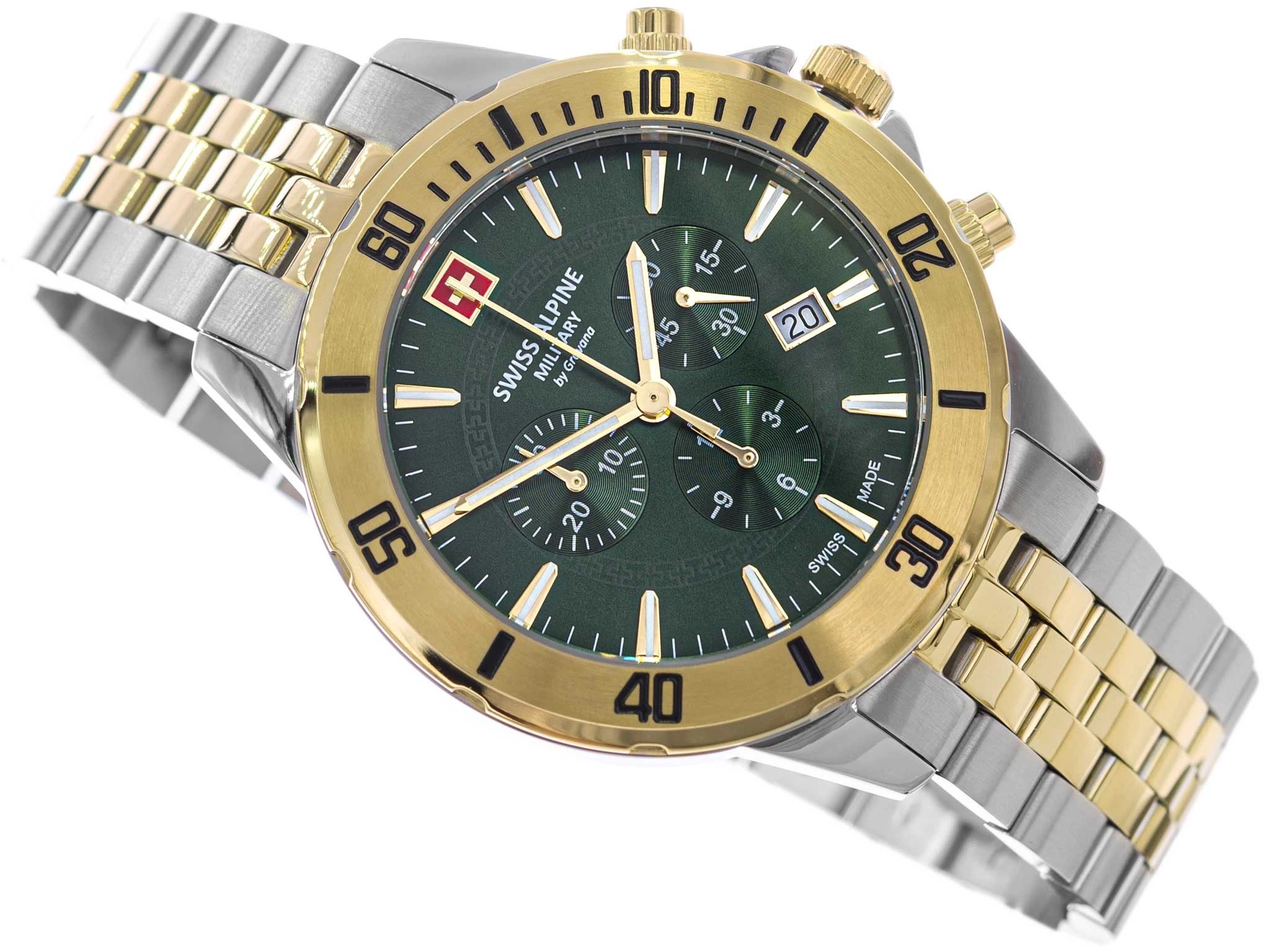 - Wodoszczelny Zegarek Męski Swiss Alpine Military SAM7024.9144 srebrno-złoty na bransolecie. Posiada funkcje neobrite, chronograf oraz datownik.