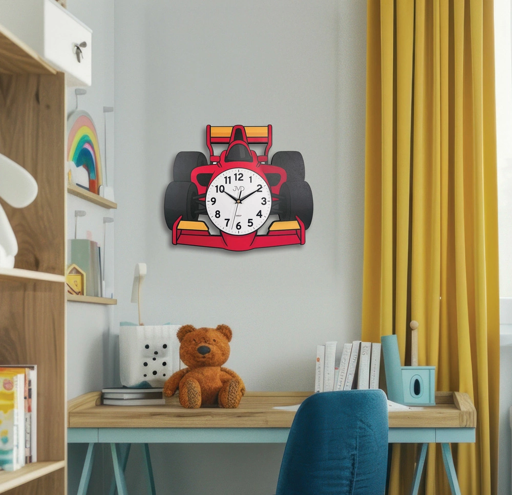 Zegar ścienny JVD HJ116 w kształcie czerwonego samochodu wyścigowego to pełna energii propozycja dla najmłodszych miłośników motoryzacji. Wykonany z trwałej płyty MDF, przyciąga uwagę intensywnym kolorem i dynamiczną formą, która ożywia dziecięce wnętrze. Duża, biała tarcza z wyraźnymi czarnymi oznaczeniami godzin i kontrastowymi aluminiowymi wskazówkami zapewnia doskonałą czytelność, a cichy mechanizm kwarcowy z płynącym sekundnikiem gwarantuje spokojną pracę bez zakłóceń. Całość emanuje lekkością i ruchem, łącząc funkcjonalność zegara z urokiem zabawkowego świata, w którym każdy detal ma znaczenie.