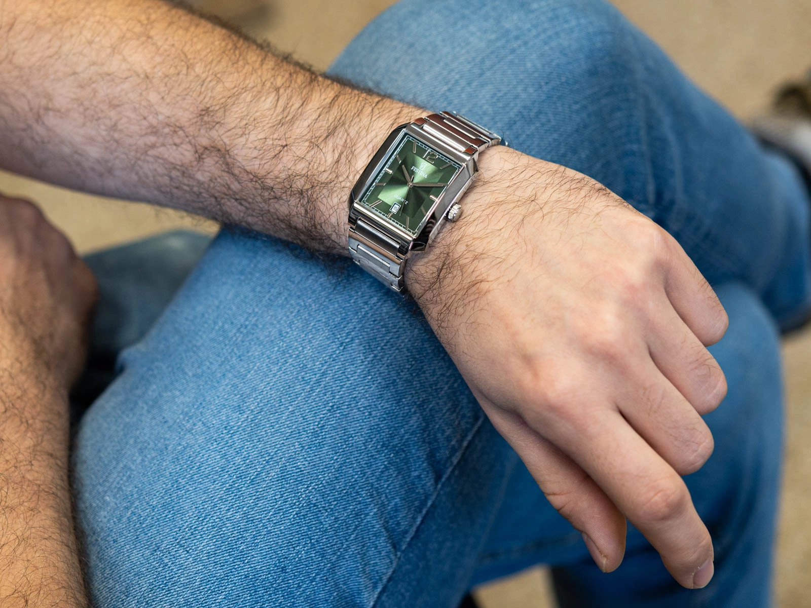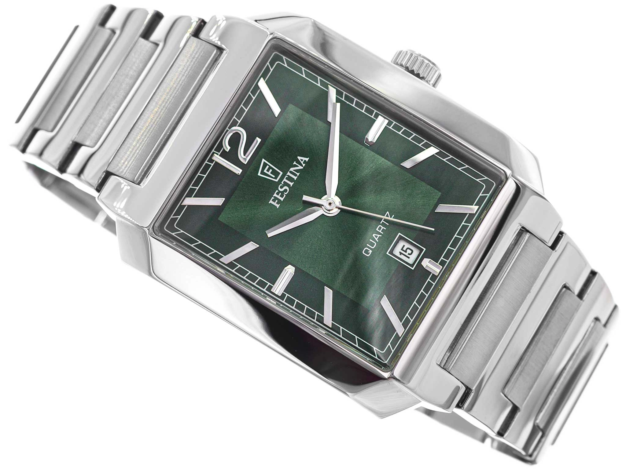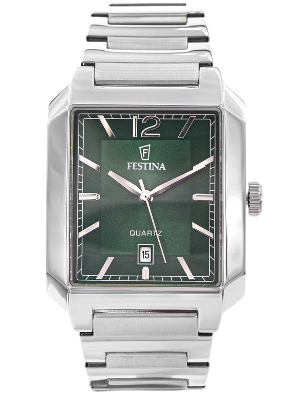 Festina F20677/5 Classic to wyrafinowany zegarek dla mężczyzny, który ceni harmonię między tradycją a nowoczesnością. Jego prostokątna koperta ze stali nierdzewnej, utrzymana w chłodnym odcieniu srebra, przywodzi na myśl ponadczasowy design minionych dekad, jednocześnie wpisując się w aktualne trendy. Całość uzupełnia elegancka, metalowa bransoleta o subtelnym połysku, tworząca spójny i wyważony duet z kopertą. Serce modelu stanowi precyzyjny mechanizm kwarcowy, zasilany baterią, który gwarantuje niezawodność i dokładność pomiaru czasu każdego dnia. Zielona tarcza przyciąga wzrok głębią koloru, nadającym jej elegancki charakter. Smukłe indeksy ułatwiają szybki odczyt godziny, a na wysokości godziny 6 znalazł się datownik, dyskretnie informujący o dniu miesiąca.