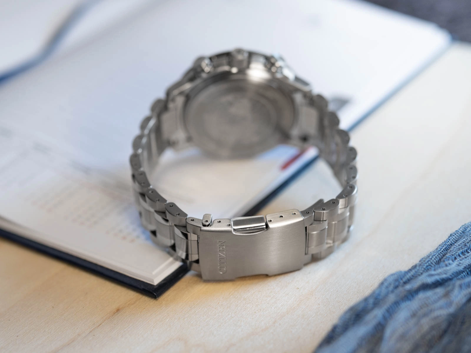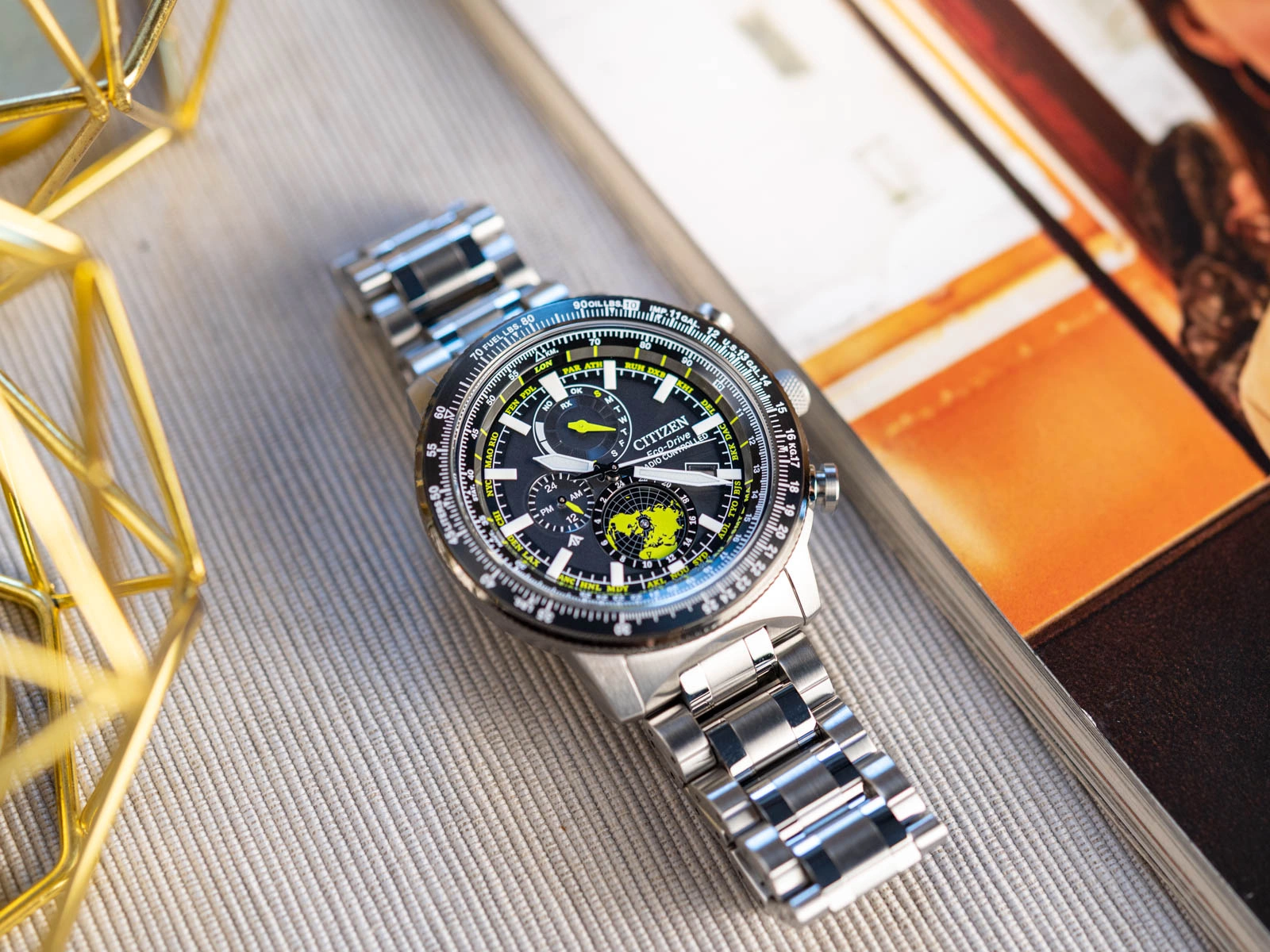 Projekt tarczy odzwierciedla głęboki szacunek marki Citizen do tradycji nawigacji i kartografii. Centralny czarny cyferblat o satynowym, lekko ziarnistym wykończeniu przypomina powierzchnię instrumentów pokładowych, a na jego obrzeżu umieszczono nazwy miast zapisane charakterystyczną czcionką inspirowaną mapami z epoki wielkich odkryć geograficznych. Subtelne detale, takie jak lekko wypukłe indeksy i delikatne linie siatki czasowej, nadają kompozycji technicznego, niemal naukowego wyrazu. W dolnej części tarczy znajduje się obrotowy dysk UTC ozdobiony mapą półkuli północnej – element, który nie tylko przyciąga wzrok, ale pozwala również odczytać orientacyjny czas w dowolnym punkcie tej części globu po odpowiednim ustawieniu względem zewnętrznego pierścienia. Wskazówki zaprojektowano z myślą o maksymalnej czytelności. Szeroka, wydłużona wskazówka minutowa oraz masywniejsze, krótsze wskazówki godzinowe tworzą kompozycję o wyjątkowej równowadze, a ich wyrazisty kształt zapewnia intuicyjny odczyt nawet w warunkach ograniczonej widoczności. Pokrywająca je powłoka Super-LumiNova intensywnie rozświetla się po wcześniejszym naświetleniu, tworząc efekt przypominający instrumenty pokładowe samolotu nocą. Indeksy, wykonane z dbałością o symetrię, także pokryto fosforyzująca powłoką, co pozwala utrzymać doskonałą czytelność w każdych warunkach.
