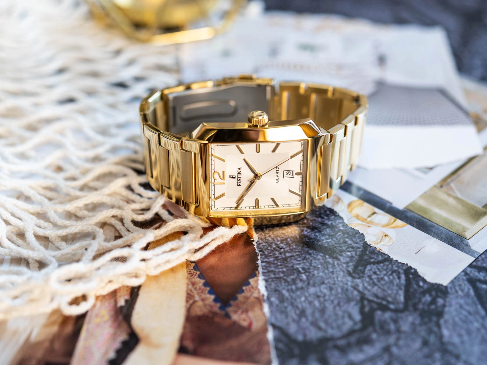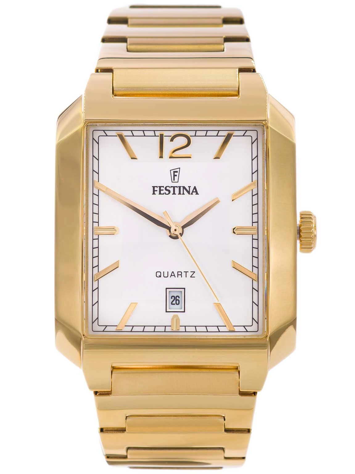 Festina F20678/2 Classic to propozycja dla mężczyzn, którzy cenią elegancję i złote akcenty. Prostokątna koperta w odcieniu złota, wykonana ze stali nierdzewnej, nawiązuje do klasyki minionych lat, zachowując jednocześnie nowoczesny charakter. Została zestawiona z dopasowaną bransoletą o subtelnym połysku, tworząc spójną, minimalistyczną całość. Sercem zegarka jest precyzyjny mechanizm kwarcowy, znany z niezawodności i dokładności chodu. Jasna, czytelna tarcza chroniona szkłem mineralnym została ozdobiona pionowymi, kontrastującymi indeksami, które ułatwiają szybki odczyt godziny. Na wysokości godziny 6 znajduje się praktyczne okienko datownika wskazujące dzień miesiąca.