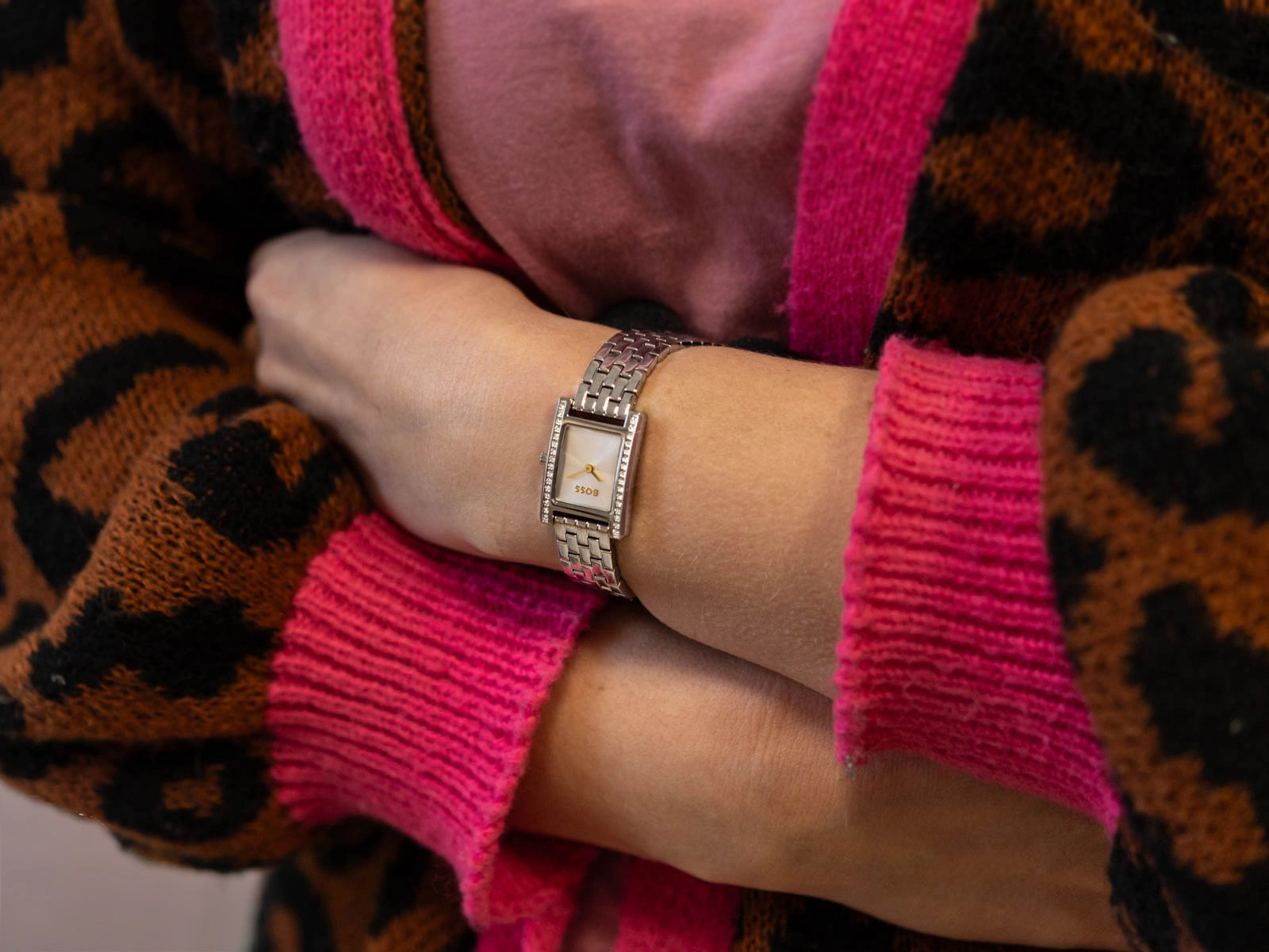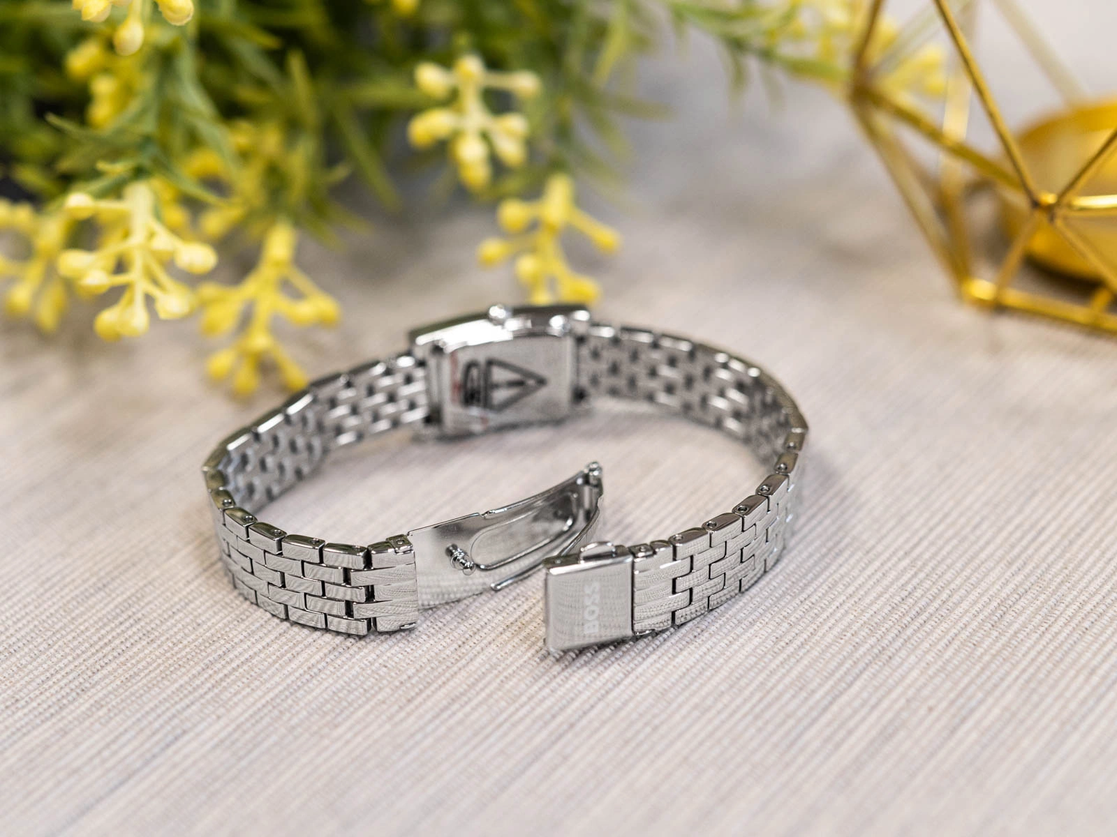 Hugo Boss 1502816 Lucia Precious to zegarek, który emanuje kobiecą elegancją i subtelnym blaskiem. Prostokątna koperta w kolorze srebrnym została ozdobiona dwoma rzędami kryształków, które delikatnie odbijają światło, tworząc efekt biżuteryjnego połysku. Całość dopełnia srebrna bransoleta ze stali szlachetnej, zapinana na eleganckie zapięcie motylkowe, gwarantujące wygodę i pewne dopasowanie do nadgarstka. Srebrna tarcza z finezyjnym szlifem słonecznym subtelnie mieni się w zależności od kąta padania światła, podkreślając luksusowy charakter modelu. Złote wskazówki i minimalistyczne logo tworzą kompozycję, która zachwyca prostotą i harmonią formy. Całość chroni szkło mineralne, odporne na zarysowania, a sercem zegarka jest precyzyjny mechanizm kwarcowy, zapewniający niezawodne działanie na co dzień. Hugo Boss 1502816 Lucia Precious to zegarek, który stanowi kwintesencję kobiecego stylu – łączy delikatność z elegancją, a subtelne detale czynią go idealnym dodatkiem zarówno do klasycznych, jak i wieczorowych stylizacji. To wyrafinowany akcent, który podkreśla naturalne piękno i elegancję swojej właścicielki. Zegarek został spakowany w oryginalne pudełko producenta, które sprawdzi się również w charakterze eleganckiego opakowania na prezent.