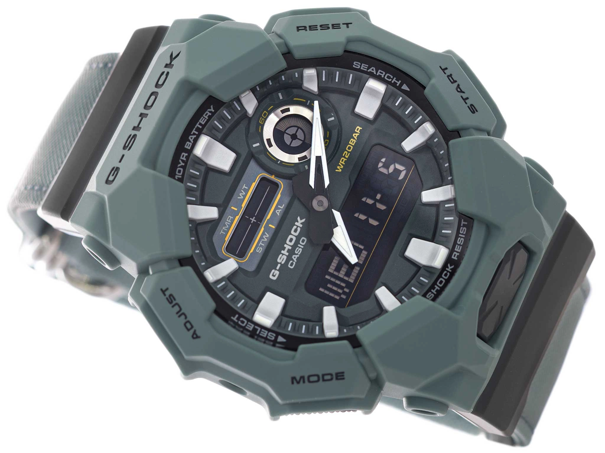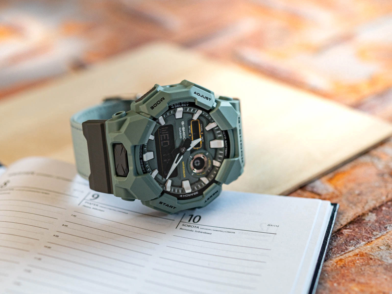 Model GA-010CE-2AER oferuje zestaw funkcji niezbędnych w codziennym rytmie i podczas aktywności. Stoper, timer, pięć alarmów, czas światowy oraz automatyczny kalendarz tworzą praktyczny zestaw narzędzi, który pozostaje przy tym wyjątkowo energooszczędny. Zastosowana bateria zapewnia pracę przez około dziesięć lat, co podkreśla długowieczność i bezobsługowy charakter zegarka. Wodoszczelność na poziomie 200 metrów pozwala korzystać z niego zarówno podczas pływania, jak i zanurzeń pod wodą. To czasomierz, który łączy sportowy charakter z subtelnym, świeżym akcentem kolorystycznym. Niebiesko-seledynowa tonacja nadaje mu lekkości i naturalności, tworząc design, który przyciąga wzrok i harmonijnie łączy nowoczesną estetykę z filozofią zrównoważonego tworzenia.