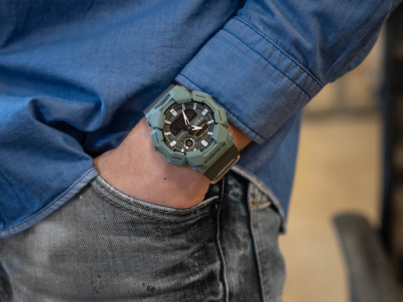 Casio G-Shock GA-010CE-2AER wyróżnia się połączeniem wytrzymałej konstrukcji z odświeżoną, lekką estetyką osadzoną w chłodnej palecie barw. Jego projekt opiera się na tonach niebieskiego i seledynowego, które nadają kopercie i paskowi nowoczesny, przyjemnie organiczny wyraz. Delikatne przejścia od głębszego błękitu do jaśniejszych, pastelowych akcentów sprawiają, że sylwetka zegarka zyskuje miękkość, zachowując jednocześnie techniczny charakter typowy dla serii G-Shock. Analogowo-cyfrowa tarcza komponuje się z tą kolorystyką podkreślając głębię ompozycji.