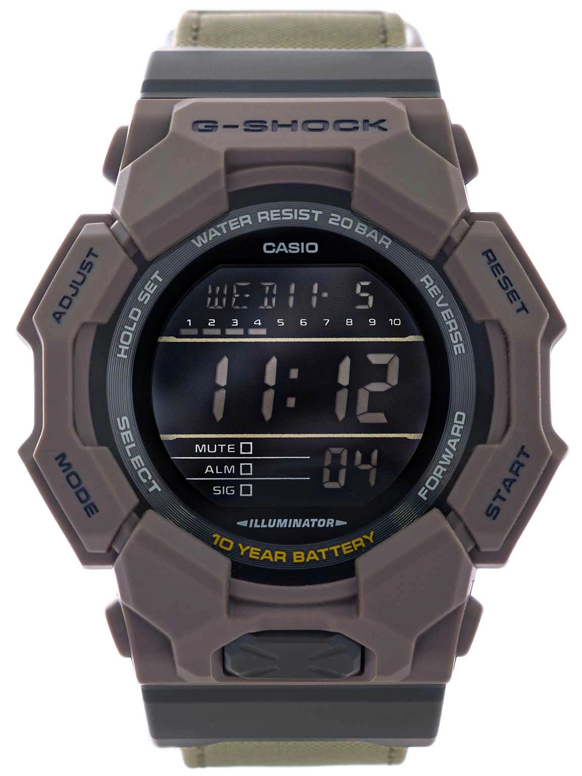 Casio G-Shock GD-010CE-5ER to zegarek o wyraźnie taktycznym charakterze, w którym funkcjonalność spotyka się z dyskretną estetyką zapożyczoną z wojskowego rynsztunku. Bryła koperty, odlana z bio-żywicy w ciepłych odcieniach brązu, sprawia wrażenie zredukowanej i przemyślanej formy: surowej, lecz starannie dopracowanej. Matowa faktura materiału tłumi refleksy, dzięki czemu konstrukcja nie przyciąga niepożądanego zainteresowania, a jednocześnie zachowuje solidny, utylitarny wygląd. Negatywowy wyświetlacz, osadzony w centrum tej stonowanej kompozycji, dodaje całości surowego, nowoczesnego wyrazu — ciemne tło i jasne, kontrastowe wskazania tworzą czytelną płaszczyznę informacyjną, która podkreśla użytkowy charakter zegarka.