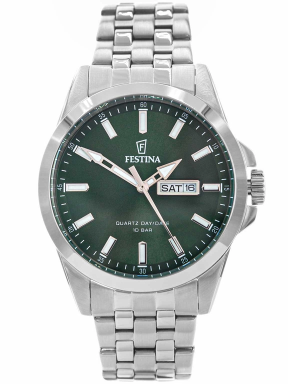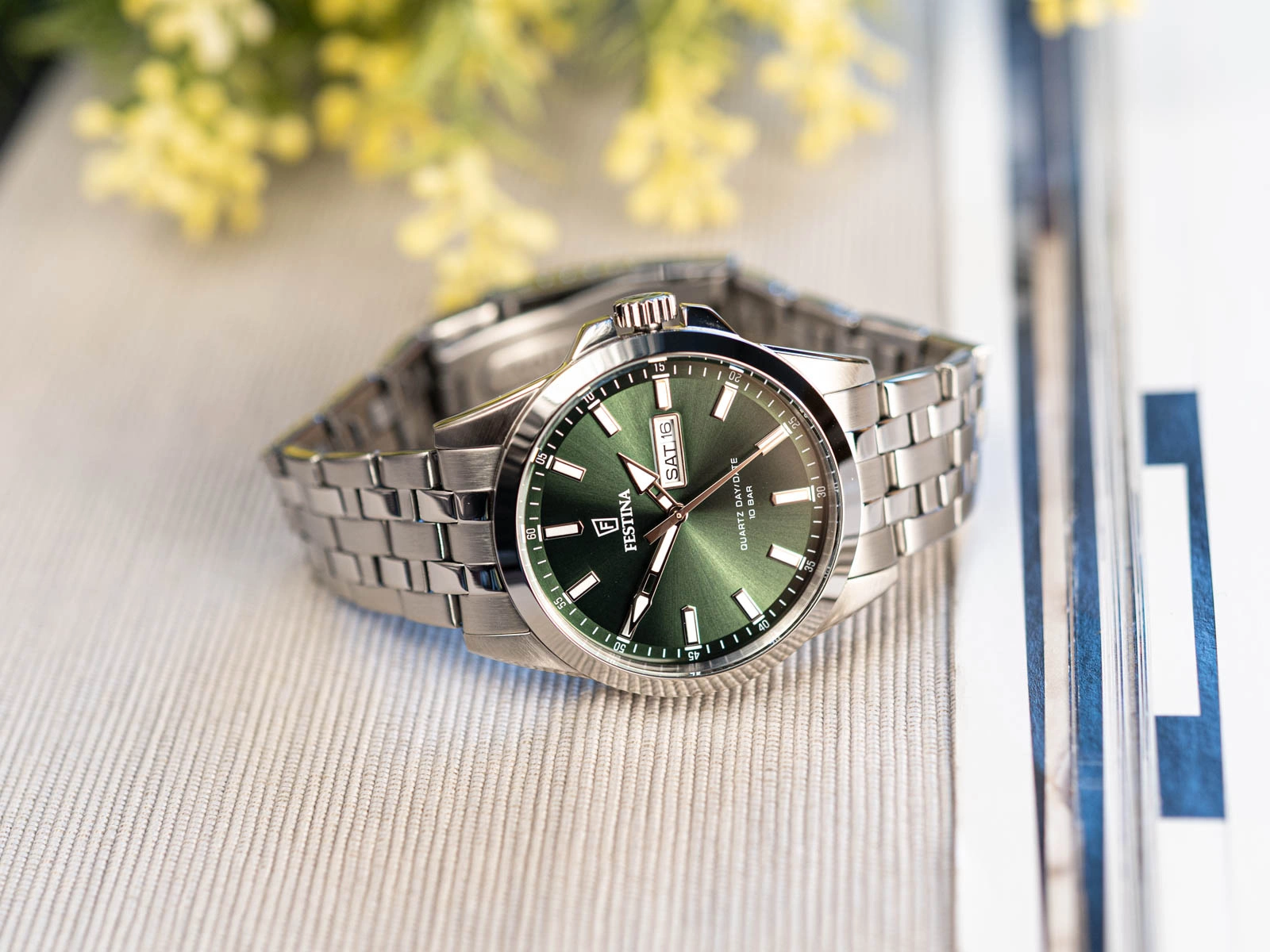 Uwagę przyciąga stylowa, zielona tarcza z wyraźnymi indeksami, które zapewniają doskonałą czytelność wskazań. Kontrast pomiędzy głębokim odcieniem zieleni a metalicznymi akcentami nadaje zegarkowi wyjątkowego charakteru. Wskazówki pokryto warstwą neobrite, dzięki czemu pozostają widoczne także po zmroku. Dodatkowym atutem jest funkcjonalny datownik, prezentujący zarówno dzień tygodnia, jak i dzień miesiąca, praktyczne rozwiązanie dla osób ceniących porządek i wygodę. Tarczę chroni odporne na zarysowania szkło mineralne, a stalowa konstrukcja skutecznie zabezpiecza zegarek przed uszkodzeniami i działaniem czynników zewnętrznych. Dzięki smukłemu profilowi Festina F20357/5 doskonale układa się na nadgarstku i z łatwością mieści pod mankietem koszuli. To uniwersalny dodatek, który sprawdzi się zarówno w zestawieniach biznesowych, jak i codziennych, nadając każdej stylizacji odrobinę klasy. Model dostarczany jest w eleganckim pudełku, to idealny pomysł na gustowny prezent.
