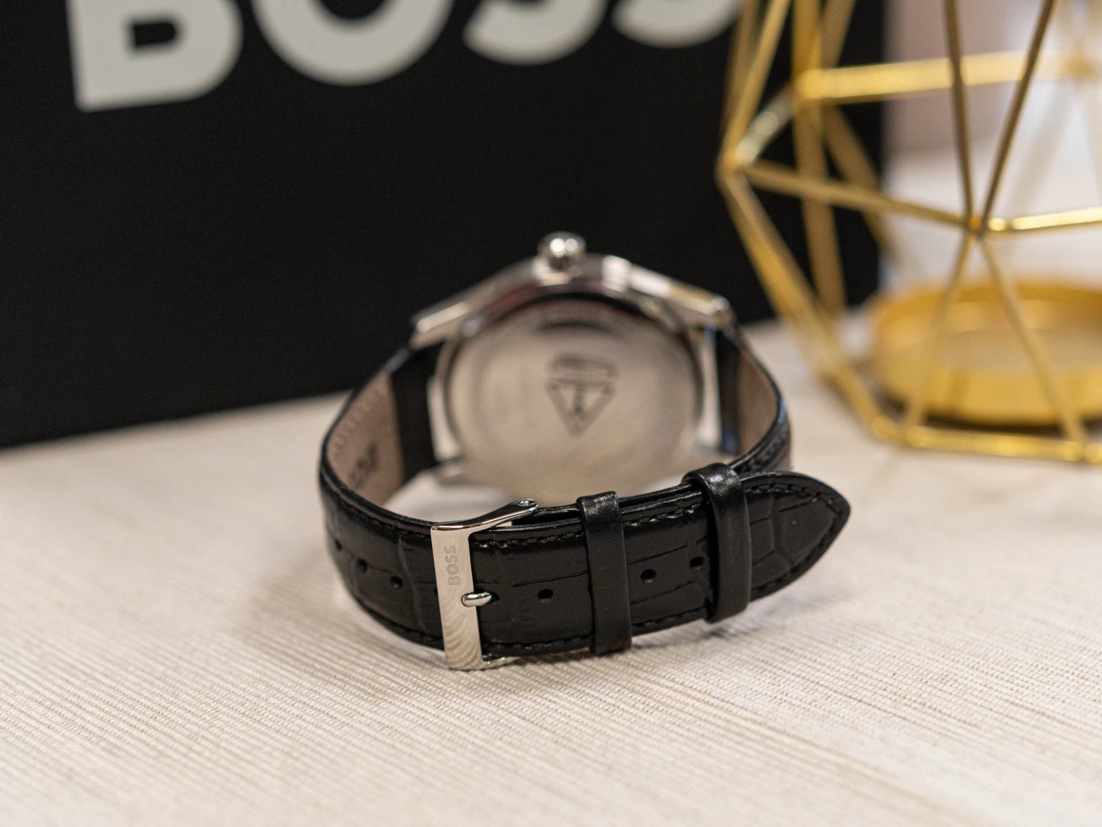 Hugo Boss 1570190 Principle to zegarek, który łączy klasyczną elegancję z subtelną nowoczesnością, tworząc ponadczasowy dodatek o wyjątkowo szlachetnym charakterze. Srebrna koperta ze stali szlachetnej harmonizuje z czarnym skórzanym paskiem z naturalnej skóry, którego tradycyjne zapięcie na sprzączkę podkreśla jego formalny, biżuteryjny profil. Całość emanuje spokojną, stonowaną elegancją, doskonale odnajdującą się w codziennym użytkowaniu oraz bardziej uroczystych stylizacjach. Czarna tarcza została wykończona delikatną fakturą, która nadaje jej głębi i przyciąga wzrok subtelną grą światła. Srebrne rzymskie indeksy podkreślają klasyczne korzenie projektu, tworząc wyważoną kompozycję ze smukłymi wskazówkami i minimalistycznym logo marki. Niewielkie okienko datownika dyskretnie wkomponowano w strukturę cyferblatu, dodając funkcjonalności bez zaburzania harmonii estetycznej. Całość chroni szkło mineralne, a o precyzję pomiaru dba niezawodny mechanizm kwarcowy. Starannie dopracowane proporcje oraz eleganckie zestawienie kolorystyczne sprawiają, że Hugo Boss 1570190 Principle staje się ponadczasowym wyborem dla osób ceniących klasykę w nowoczesnym wydaniu. Zegarek oferowany jest w eleganckim pudełku producenta, wzbogaconym o skórzane etui na karty – element, który podkreśla prestiżowy, prezentowy charakter całego kompletu.
