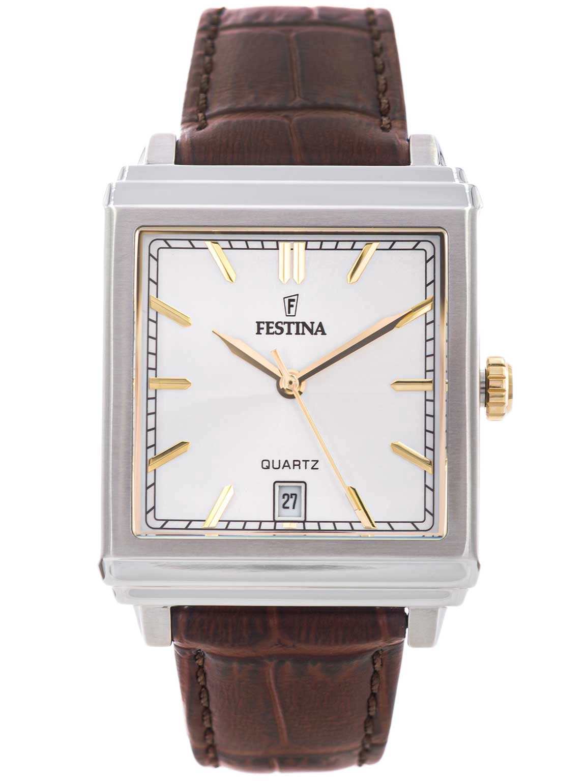 Festina F20681/4 Classic to wyjątkowy hołd dla ponadczasowego stylu retro, w którym klasyczna elegancja spotyka się z nowoczesną prostotą. Projekt tego modelu inspirowany jest duchem dawnych lat, kiedy zegarki stanowiły nie tylko narzędzie pomiaru czasu, ale także symbol wyrafinowanego gustu i dobrego stylu. Kwadratowa koperta, rzadko spotykana we współczesnym wzornictwie, przywołuje klimat minionej epoki, a jednocześnie wyróżnia się nowoczesną lekkością formy. Jej harmonijne proporcje oraz delikatne wykończenia sprawiają, że zegarek przyciąga wzrok subtelną elegancją. Srebrna tarcza zachwyca przejrzystością i doskonałym balansem detali. Złote wskazówki oraz indeksy dodają całości szlachetnego blasku, tworząc eleganckie połączenie klasyki i minimalizmu. Na godzinie szóstej umieszczono datownik, który dyskretnie podkreśla funkcjonalny charakter zegarka, nie zaburzając jego spójnej kompozycji.