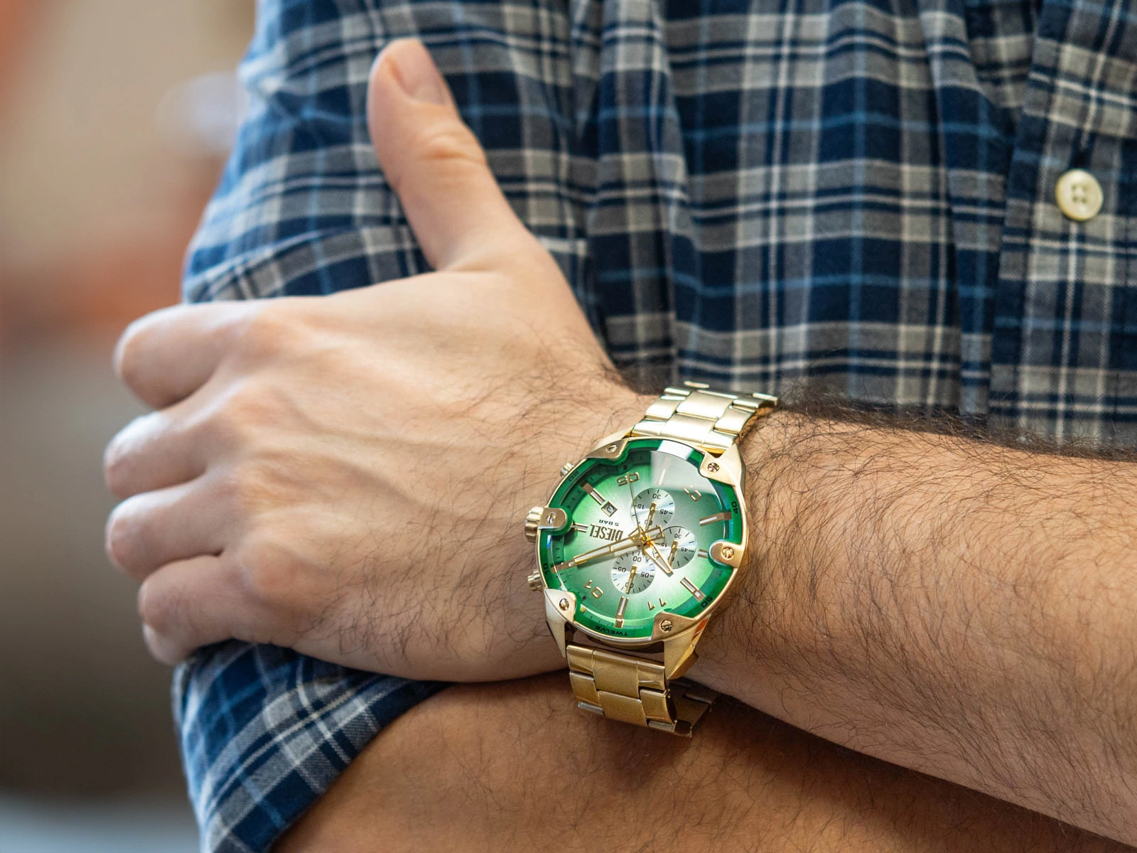Diesel DZ4685 Spiked powstał jako manifest odważnej stylistyki, w której złoto staje się językiem nowoczesnej męskiej elegancji. Jego masywna, wykonana ze stali szlachetnej koperta tworzy jednolitą całość z bransoletą, a metaliczny połysk nadaje konstrukcji wymiaru nie tylko luksusowego, lecz także wyrazistego, pełnego charakteru. Na tle tej zdecydowanej oprawy pojawia się tarcza w głębokim odcieniu zieleni, której dynamiczny rysunek i wyraziste cyfry arabskie ożywiają całość energią typową dla miejskiego designu. Model działa na bazie precyzyjnego mechanizmu kwarcowego, który odpowiada za płynność działania chronografu z trzema subtarcza­mi. Dzięki niemu wskazania zachowują klarowność, a dodatkowy datownik subtelnie uzupełnia kompozycję, nie odciągając uwagi od głównej struktury tarczy. Dla lepszej czytelności w słabym oświetleniu indeksy i wskazówki zostały wyposażone w elementy z fosforyzująca powłoka neobrite, która po wcześniejszym naświetleniu będą świecić przez jakiś czas ułatwiając odczytanie wskazań. Mineralne szkło chroni cały układ przed a zakręcany dekiel wzmacnia konstrukcję, tworząc solidną barierę dla codziennych wyzwań. Złota bransoleta o satynowym wykończeniu układa się gładko na nadgarstku, dając poczucie stabilności i jednocześnie lekkości. DZ4685 Spiked to jeden z tych modeli, które łączą siłę współczesnego designu z funkcjonalnością, jakiej oczekuje się od zegarka męskiego w miejskim stylu. Wyrazista kolorystyka, mocna bryła i dopracowana detaliczność sprawiają, że staje się on dodatkiem budującym wizerunek mężczyzny świadomie sięgającego po elementy o niepowtarzalnym charakterze. Całość zapakowana jest w eleganckie pudełko, co czyni ten czasomierz świetnym wyborem na prezent.