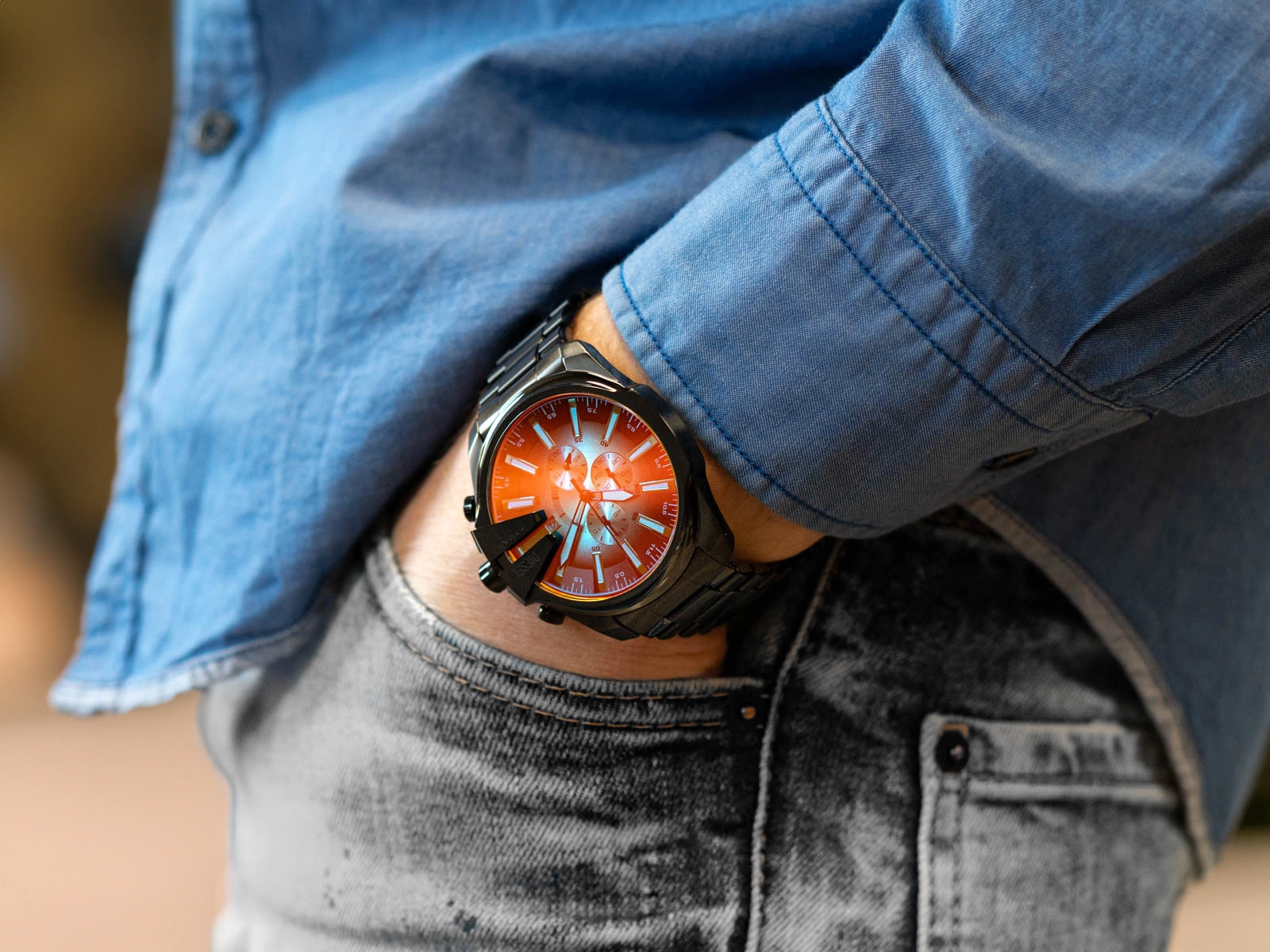 Diesel Mega Chief Slim DZ4689 powstał jako projekt, w którym nowoczesność zyskuje formę pełną zdecydowania i miejskiej energii. Jego masywna, utrzymana w czerni koperta ze stali szlachetnej tworzy spójną całość z bransoletą, a grafitowy odcień metalu nadaje konstrukcji głębi i industrialnego charakteru. Na tle tej wyrazistej oprawy pojawia się tarcza, której wielobarwna kompozycja przechodzi od intensywnych tonów czerwieni po chłodne akcenty niebieskiego, tworząc dynamiczny kontrast o wyjątkowo współczesnym wyrazie. W centrum projektu pracuje precyzyjny mechanizm kwarcowy, odpowiadający za płynność i pewność wskazań. Jego praca podkreśla minimalistycznie ujęty datownik, który subtelnie wtapia się w wielokolorową powierzchnię tarczy, tworząc eleganckie połączenie funkcjonalności i estetycznej lekkości. Mineralne szkło chroni całość przed codziennymi, jednocześnie zachowując klarowność i przejrzystość wyświetlania czasu. Zgrabna konstrukcja koperty sprawia, że zegarek zachowuje solidność typową dla linii Mega Chief, jednocześnie oferując bardziej opływowy, zbalansowany profil. Bransoleta ze stali szlachetnej płynnie układa się na nadgarstku, a jej wykończenie dodaje całości elegancji w nowoczesnym wydaniu. Diesel Mega Chief Slim DZ4689 to propozycja dla mężczyzny, który odnajduje się w świecie świadomych wyborów estetycznych. Kolorystyczna odwaga tarczy, mocna konstrukcja i dopracowane detale sprawiają, że model staje się elementem budującym styl, a nie jedynie uzupełniającym go. To zegarek dla tych, którzy szukają połączenia modowego podejścia z funkcjonalnym, solidnym wykonaniem.
