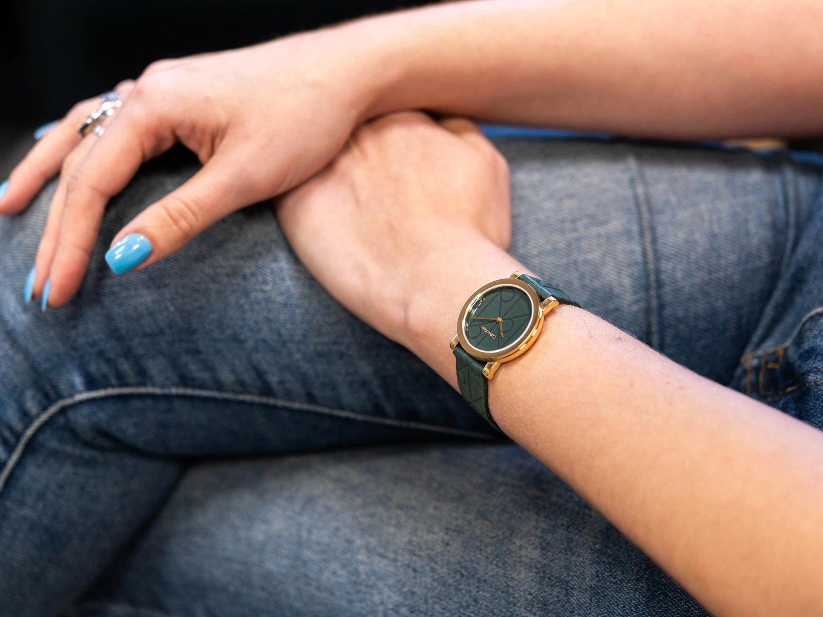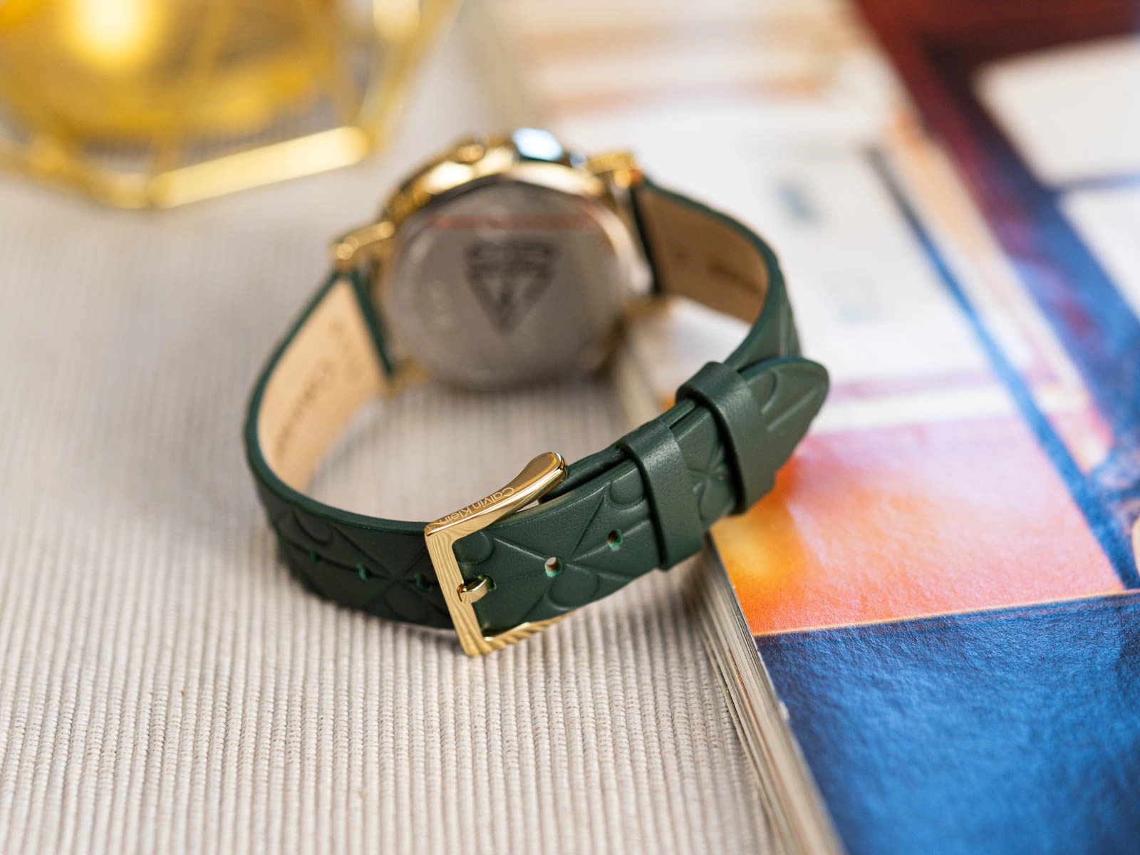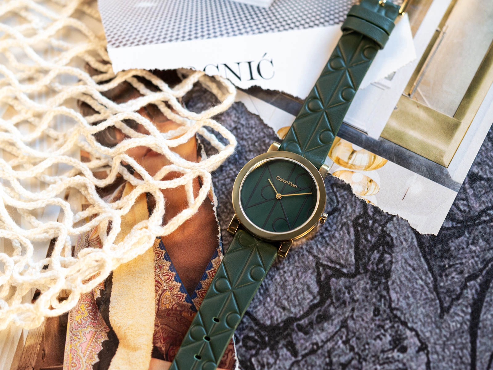 Calvin Klein 25100129 Monogram interpretuje minimalizm w odcieniach, które nadają mu świeżości i wyrafinowanej lekkości. Złota koperta ze stali szlachetnej tworzy jasną ramę dla zielonej tarczy, której jednolita powierzchnia przyciąga uwagę intensywnością koloru. Złote wskazówki poruszają się po niej z delikatnym połyskiem, podkreślając harmonijny dialog między ciepłem metalu a chłodem zieleni. Brak indeksów sprawia, że przestrzeń pozostaje niezakłócona, a jedynym detalem wyróżniającym się na tle tarczy jest subtelne logo, które dyskretnie akcentuje charakter marki. Zielony pasek z naturalnej skóry płynnie dopełnia kompozycję, wprowadzając spójność i elegancję o nieco bardziej współczesnym wydźwięku. Zapinany na klasyczną sprzączkę, oferuje wygodę i pewność noszenia, podczas gdy mineralne szkło i mechanizm kwarcowy dbają o niezawodność i praktyczność tego harmonijnie skomponowanego modelu.