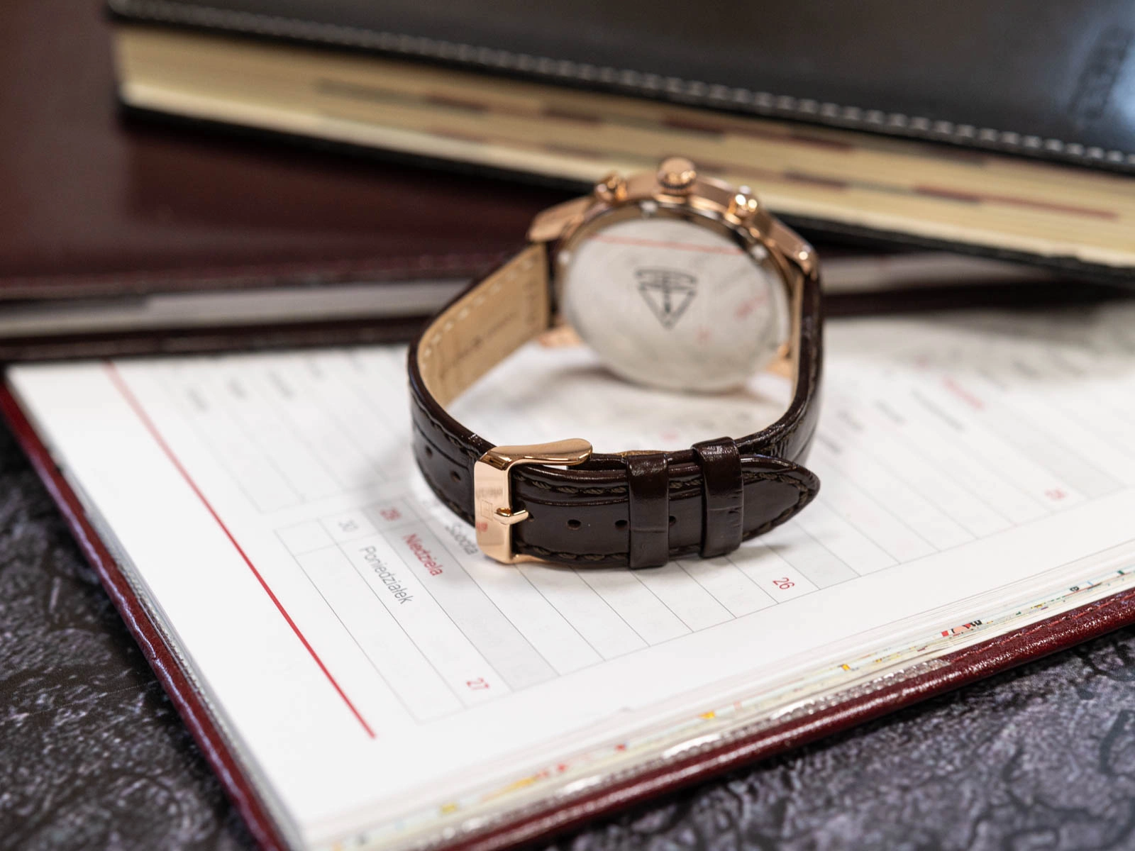 Tommy Hilfiger 1710727 został zaprojektowany jako klasyczny zegarek analogowy o wyważonej konstrukcji i starannie dopracowanych proporcjach. Koperta wykonana ze stali szlachetnej w kolorze różowego złota tworzy solidną bazę, w której połączono trwałość materiału z subtelnym, ciepłym tonem metalu. Towarzyszy jej pasek z naturalnej skóry w odcieniu brązu, utrzymany w klasycznej formie i zapinany na tradycyjną sprzączkę, co zapewnia stabilność i komfort noszenia. Granatowa tarcza została opracowana z wykorzystaniem różnych rodzajów faktur, nadających jej głębi i wizualnego zróżnicowania. Zastosowane cyfry rzymskie w kolorze różowego złota stanowią statyczne, dekoracyjne indeksy, dodające tarczy elegancji w klasycznym wydaniu. Wskazówki w kolorze różowego złota zostały wyposażone w elementy z powłoką neobrite, aktywną po wcześniejszym naświetleniu, co umożliwia odczyt czasu w warunkach ograniczonego oświetlenia przy zachowaniu delikatnego, nienachalnego efektu luminescencyjnego. Trzy subtarcze rozmieszczone w centralnej części kompozycji odpowiadają za funkcjonalny zestaw wskazań. Prezentują rozbudowany układ datownika, obejmujący dzień tygodnia i dzień miesiąca, a także czas w formacie dwudziestoczterogodzinnym, pozwalający na intuicyjne rozróżnienie pory dobowej. Całość przykryto płaskim szkłem mineralnym, które chroni tarczę przed zarysowaniami i wpływem codziennego użytkowania. Zastosowany mechanizm kwarcowy pracuje w sposób stabilny i bezobsługowy, zapewniając precyzję i niezawodność przy zachowaniu niewielkiej grubości konstrukcji. Model Tommy Hilfiger 1710727 łączy klasyczne elementy zegarmistrzowskie z nowoczesnym wykończeniem, tworząc projekt utrzymany w eleganckim, spójnym tonie, w którym każdy detal podporządkowano harmonii formy i funkcjonalności. Całość zapakowana jest w stylowe, firmowe pudełko, które idealnie sprawdzi się jako elegancki prezent – niezależnie od okazji.