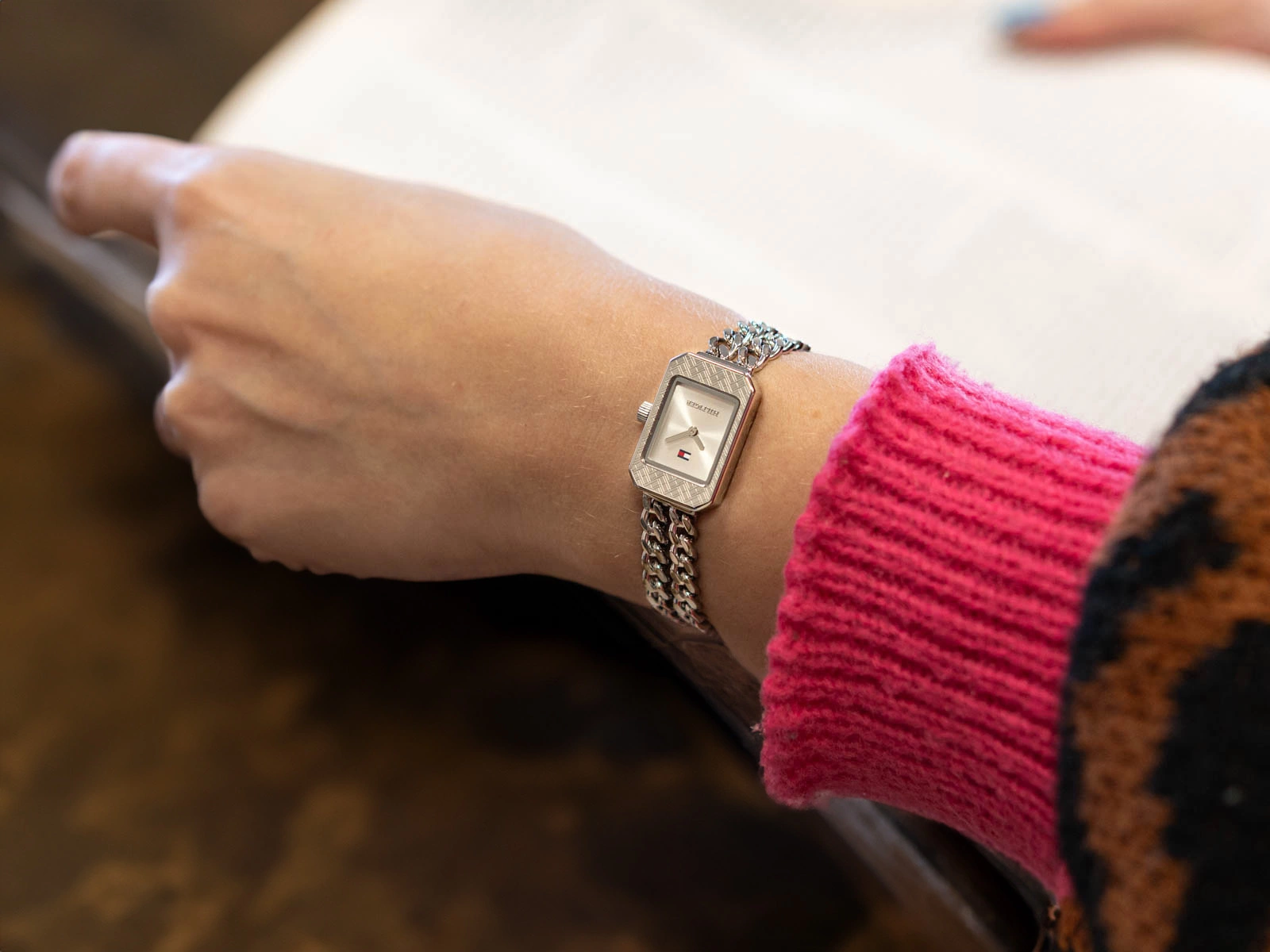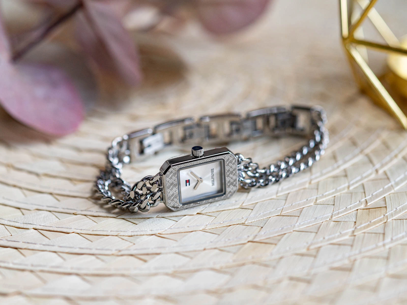 Tommy Hilfiger 1782841 Sarah to subtelne połączenie klasyki, nowoczesności i ponadczasowego blasku. Projekt tego zegarka wyróżnia się prostokątną kopertą o harmonijnych proporcjach, ozdobioną delikatnym, geometrycznym wzorem, który nadaje jej wyjątkowo biżuteryjny charakter. Każdy detal został starannie dopracowany, by stworzyć efekt elegancji widocznej w każdym świetle. Minimalistyczny cyferblat z logo marki zachwyca swoją czystością i lekkością formy, a srebrna bransoleta, częściowo utrzymana w formie stylowego łańcucha, dodaje całości nowoczesnego wyrazu. To idealne zestawienie ponadczasowego koloru i wysmakowanego designu, które sprawia, że model Sarah emanuje dyskretnym luksusem i kobiecym wdziękiem.