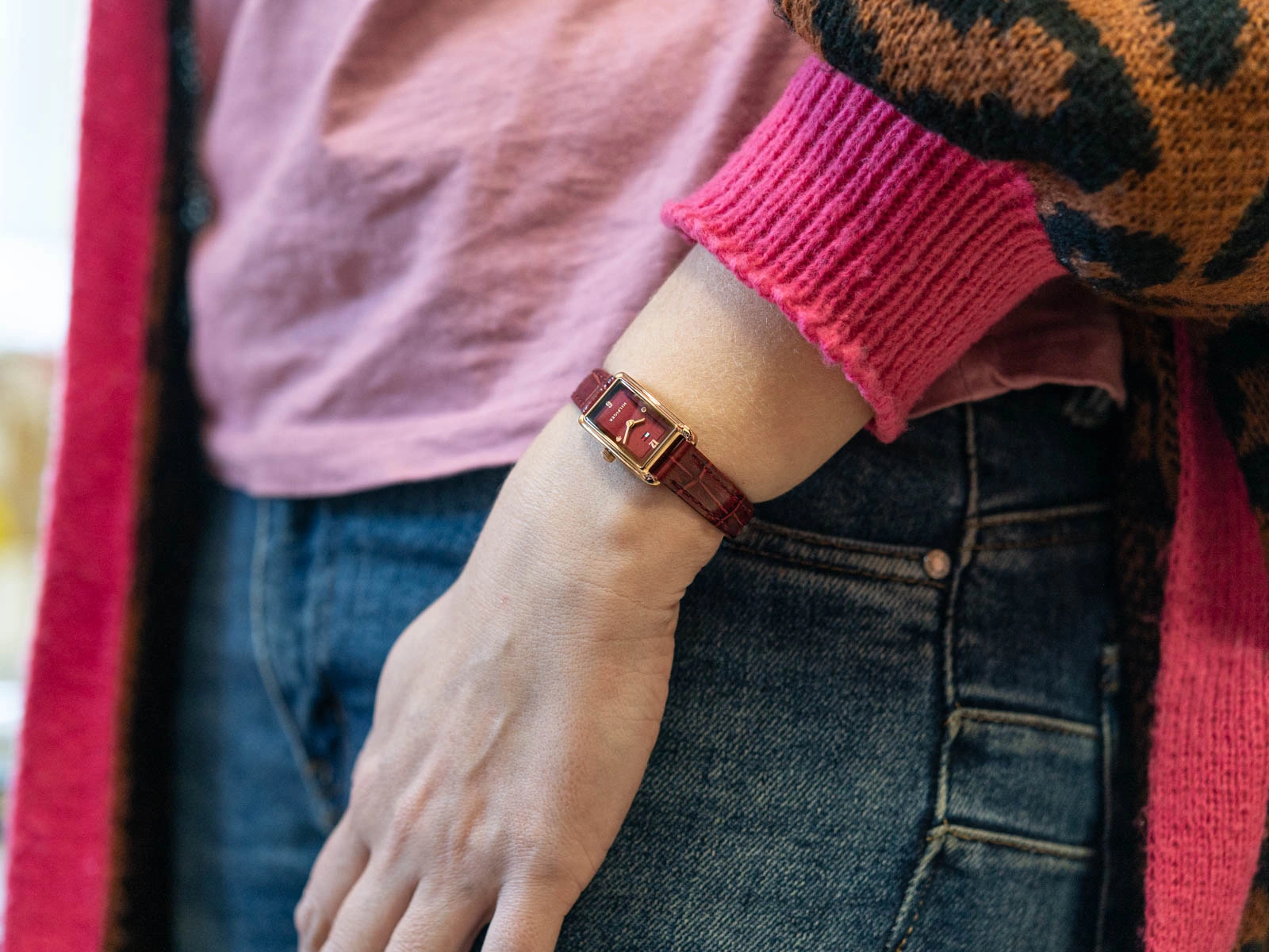 Tommy Hilfiger 1782849 Montre to wyjątkowy damski zegarek, który łączy w sobie klasyczną elegancję z nowoczesnym minimalizmem. Jego prostokątna koperta wykonana z wysokiej jakości stali nierdzewnej nawiązuje subtelnie do stylu retro, dodając całości ponadczasowego charakteru. Delikatnie zaokrąglone krawędzie i smukły profil sprawiają, że model prezentuje się niezwykle lekko i kobieco. Czerwony, skórzany pasek to odważny akcent, który wprowadza energię i wyrazistość do projektu. W połączeniu z połyskiem koperty tworzy harmonijny kontrast, przyciągający uwagę i podkreślający indywidualny styl właścicielki. Dzięki drobnym wymiarom zegarek idealnie dopasowuje się do smukłego nadgarstka, oferując pełen komfort noszenia przez cały dzień.