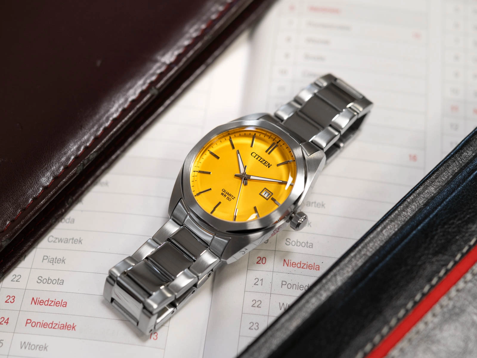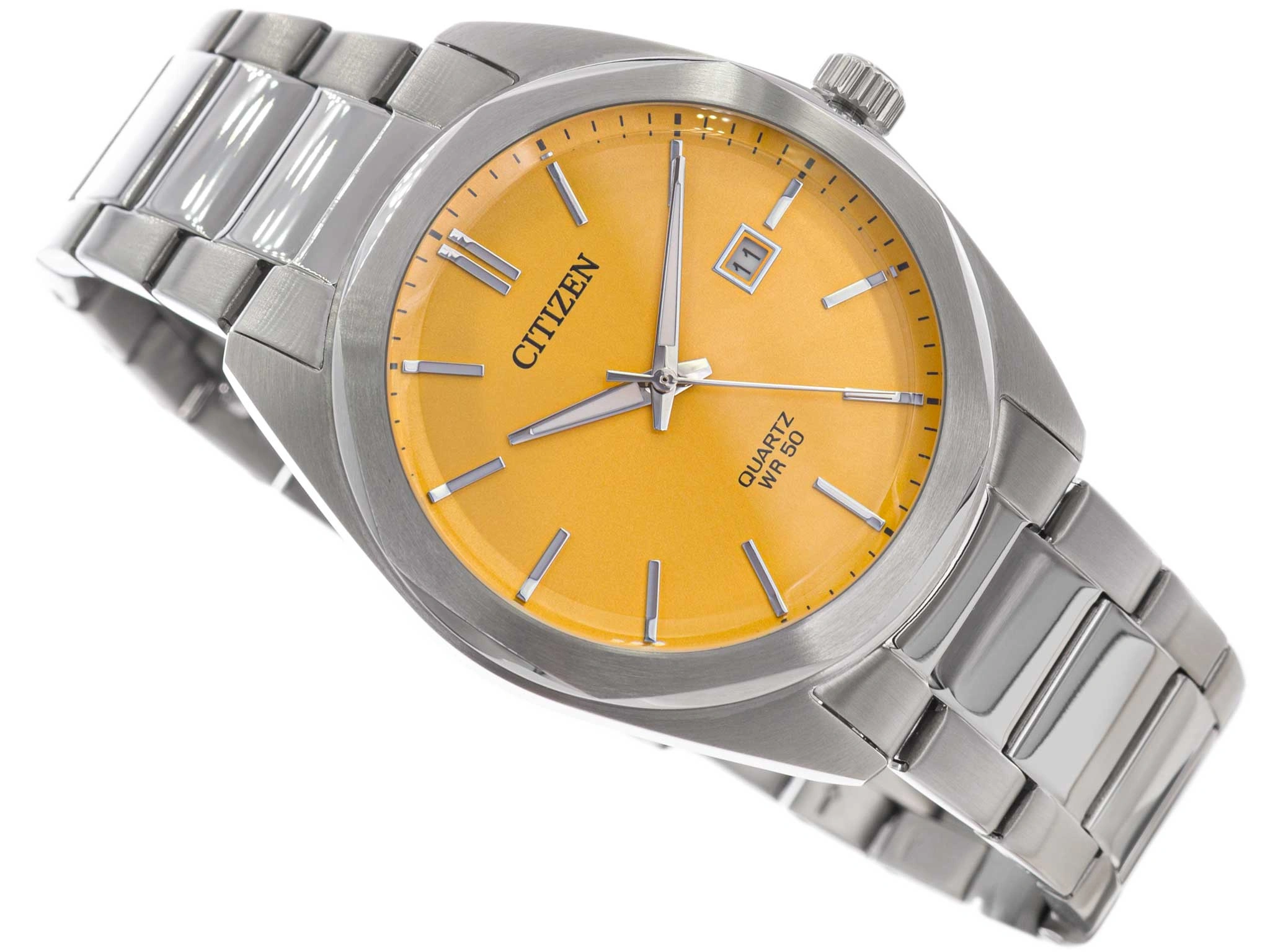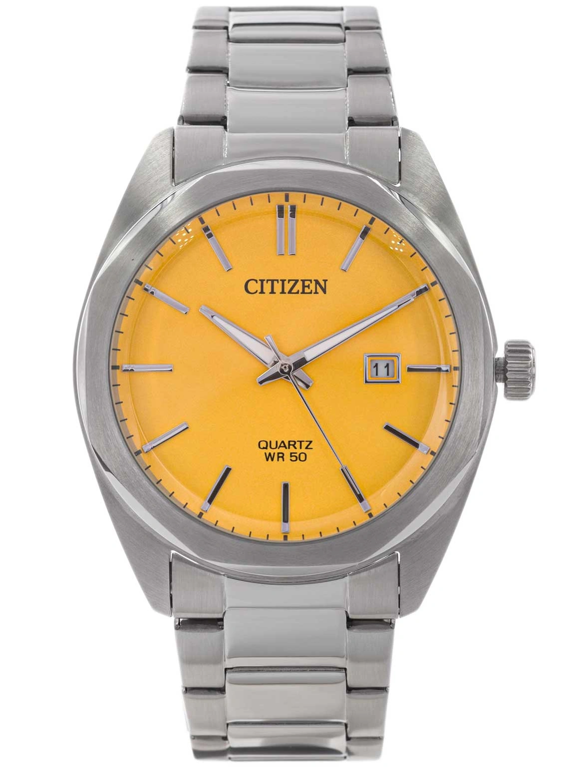 Citizen BI5110-54Z Quartz Elegance to niezwykle stylowy czasomierz, w którym ponadczasowa klasyka spotyka się z wyrazistą, nowoczesną estetyką. Srebrna koperta wraz z dopasowaną bransoletą ze stali szlachetnej tworzą elegancką, jednolitą kompozycję, charakteryzującą się szlachetnym blaskiem i solidnym wykonaniem. Całość została zaprojektowana tak, by prezentować się pewnie i profesjonalnie na każdym nadgarstku. Najbardziej wyróżniającym elementem tego modelu jest efektowna, żółta tarcza - odważna, pełna energii i przyciągająca wzrok. W zestawieniu z liniowymi, srebrnymi indeksami oraz wyraźnymi wskazówkami pokrytymi luminescencyjną powłoką Neobrite tworzy harmonijny, a zarazem niezwykle funkcjonalny układ. Dzięki temu odczyt czasu pozostaje komfortowy zarówno w świetle dnia, jak i po zmroku.