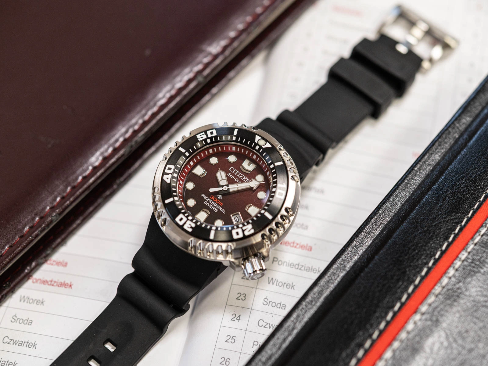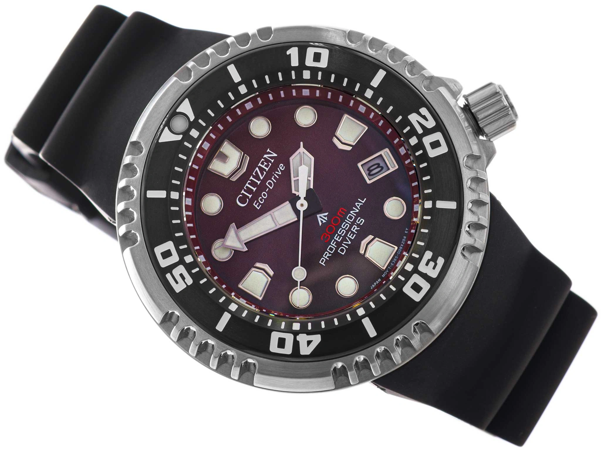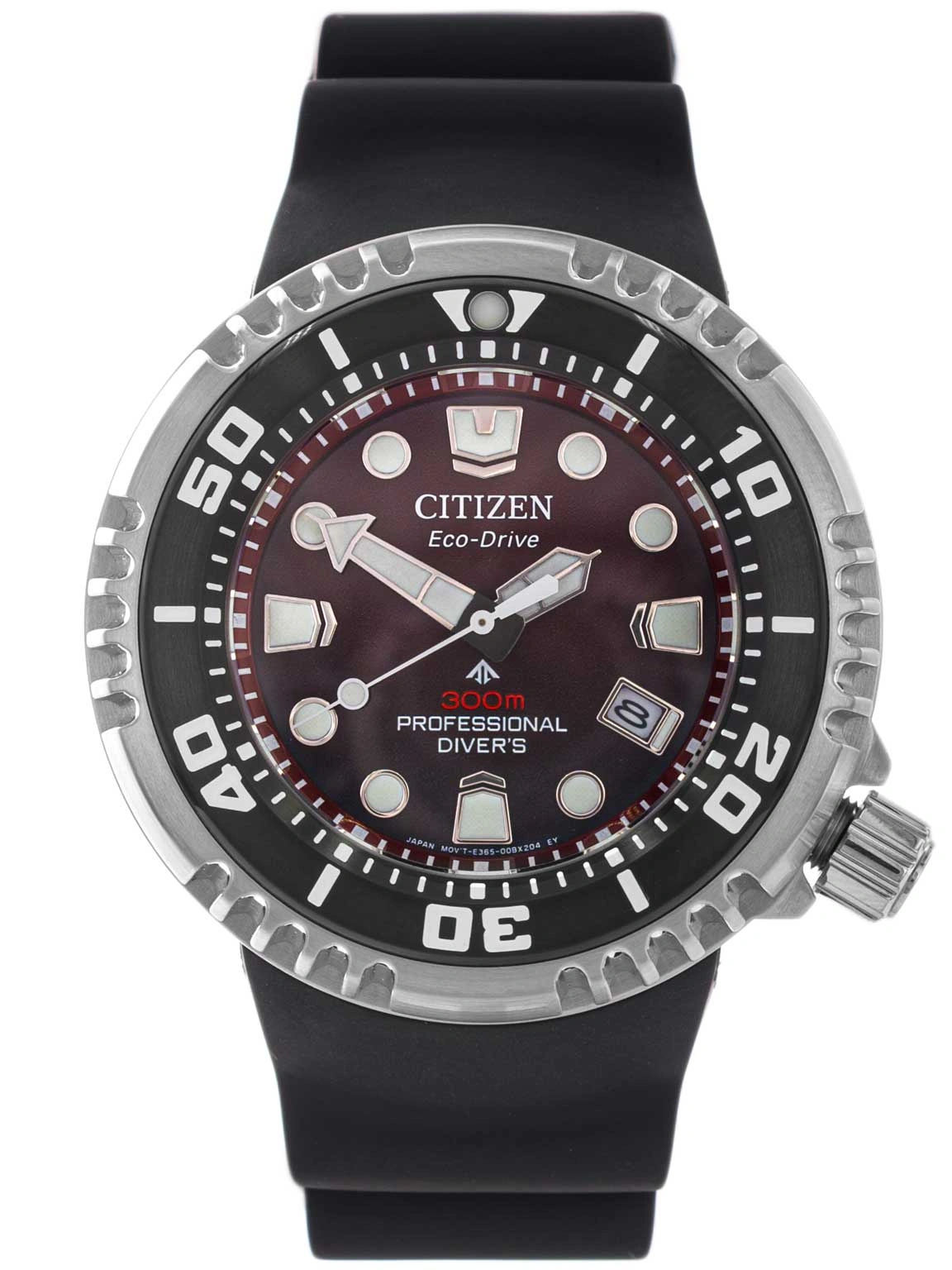 Citizen BN1024-01Z Promaster Marine Professional Diver to zegarek, który łączy potężną, solidną konstrukcję z niezwykle funkcjonalnymi rozwiązaniami, stając się niezawodnym narzędziem w ekstremalnych warunkach. Model ten wyróżnia się dynamiczną, czerwono-czarną tarczą, która nadaje czasomierzowi sportowego charakteru i jednocześnie zapewnia doskonałą czytelność dzięki wyraźnym indeksom godzinowym oraz masywnym wskazówkom wypełnionym luminescencyjną powłoką neobrite. Po wcześniejszym naświetleniu wskazówki i indeksy świecą, umożliwiając odczyt czasu w całkowitej ciemności lub w głębinach morskich.