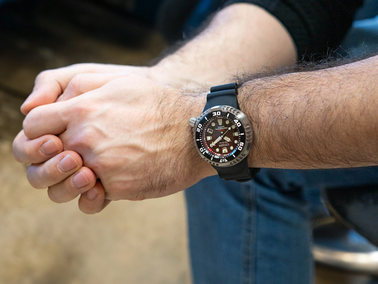 Koperta zegarka Citizen BN1024-01Z Promaster Marine Professional Diver wykonana jest z wysokiej jakości stali szlachetnej, której solidna i masywna konstrukcja natychmiast budzi zaufanie. Charakterystyczne linie koperty podkreślają techniczny, narzędziowy charakter zegarka, a zastosowane wykończenia nadają mu jednocześnie nowoczesnej elegancji. Jednokierunkowy, obrotowy bezel z wyraźnie naciętymi krawędziami został zaprojektowany tak, aby jego obsługa była intuicyjna nawet w grubych rękawicach nurkowych. Bezel umożliwia bezpieczne odmierzanie czasu zanurzenia, eliminując ryzyko przypadkowego wydłużenia nurkowania, a fosforyzujący marker pozwala w mgnieniu oka ustalić pozycję wskazówki w warunkach ograniczonej widoczności, co jest szczególnie istotne podczas głębokich nurkowań lub nocnych wypraw pod wodą.