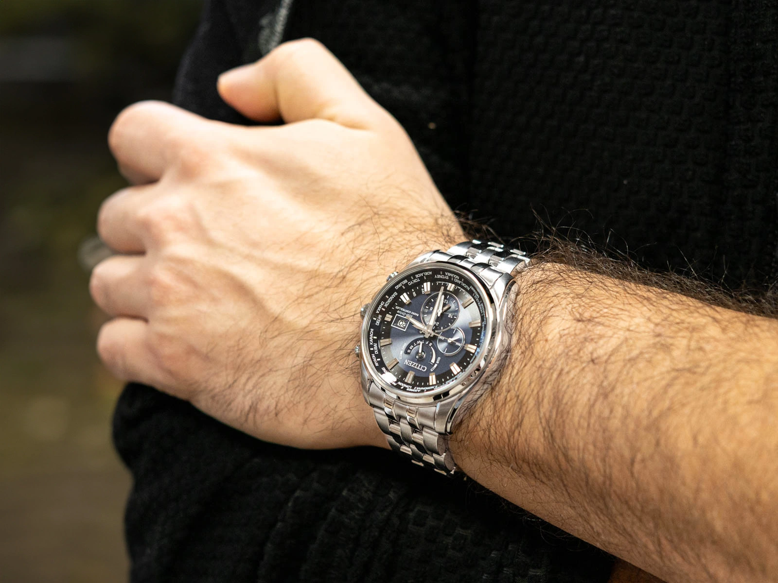 Citizen AT9030-55L Radio Controlled Dual Time to zegarek, w którym nowoczesna technologia splata się z elegancją klasycznego wzornictwa, tworząc kompozycję precyzyjną, funkcjonalną i wyjątkowo dopracowaną. Jego konstrukcja opiera się na masywnej kopercie ze stali szlachetnej, której chłodne, srebrzyste wykończenie podkreśla techniczny charakter modelu. Współgra z nią bransoleta o solidnej, pełnej budowie ogniw, zakończona zapięciem motylkowym zapewniającym płynną linię i stabilne przyleganie do nadgarstka. Całość tworzy spójną sylwetkę, w której każdy detal podporządkowany jest zasadzie trwałości i elegancji. Szafirowe szkło z powłoką antyrefleksyjną nadaje projektowi przejrzystości, chroniąc tarczę przed refleksami światła i wszelkimi zarysowaniami, co pozwala zachować jej klarowny wygląd nawet podczas intensywnego użytkowania. Granatowa tarcza staje się centrum funkcjonalnej formy, w której poszczególne elementy podporządkowane są precyzji odczytu i logice użytkowania. Liniowe indeksy w kolorze srebra podkreślają elegancję kompozycji, a ich chłodny połysk harmonizuje z barwą koperty. Wskazówki pokryte neobrite emitują subtelny blask po wcześniejszym naświetleniu, zachowując czytelność w ciemności. Na tarczy znalazł się również wskaźnik dobowy i praktyczny datownik umieszczony na godzinie trzeciej, co dodaje cyferblatowi uporządkowanego, intuicyjnego charakteru. Wnętrze skrywa mechanizm kwarcowy kalibru H820 z systemem Eco-Drive, czerpiący energię z naturalnego i sztucznego światła, dzięki czemu zegarek nie wymaga wymiany baterii. Funkcja Radio Controlled synchronizuje wskazania z zegarami atomowymi na czterech kontynentach, zapewniając wzorcową punktualność w każdej z obsługiwanych stref czasowych. Dodatkowe funkcje, takie jak dual time, automatyczna korekcja położenia wskazówek, wskaźnik rezerwy energii oraz alarm, tworzą technologiczną strukturę, która sprawia, że czasomierz staje się zaawansowanym narzędziem do zarządzania czasem. Solidność konstrukcji podkreśla wodoszczelność na poziomie 20BAR, pozwalająca bezpiecznie korzystać z zegarka podczas pływania i aktywności nad wodą. Citizen AT9030-55L Radio Controlled Dual Time łączy elegancję, technologiczną precyzję i stylistyczną spójność, tworząc model, który manifestuje nowoczesną interpretację klasyki i funkcjonalności w świecie zegarmistrzostwa. Całość zapakowana jest w eleganckie pudełko, które idealnie nadaje się na prezent.