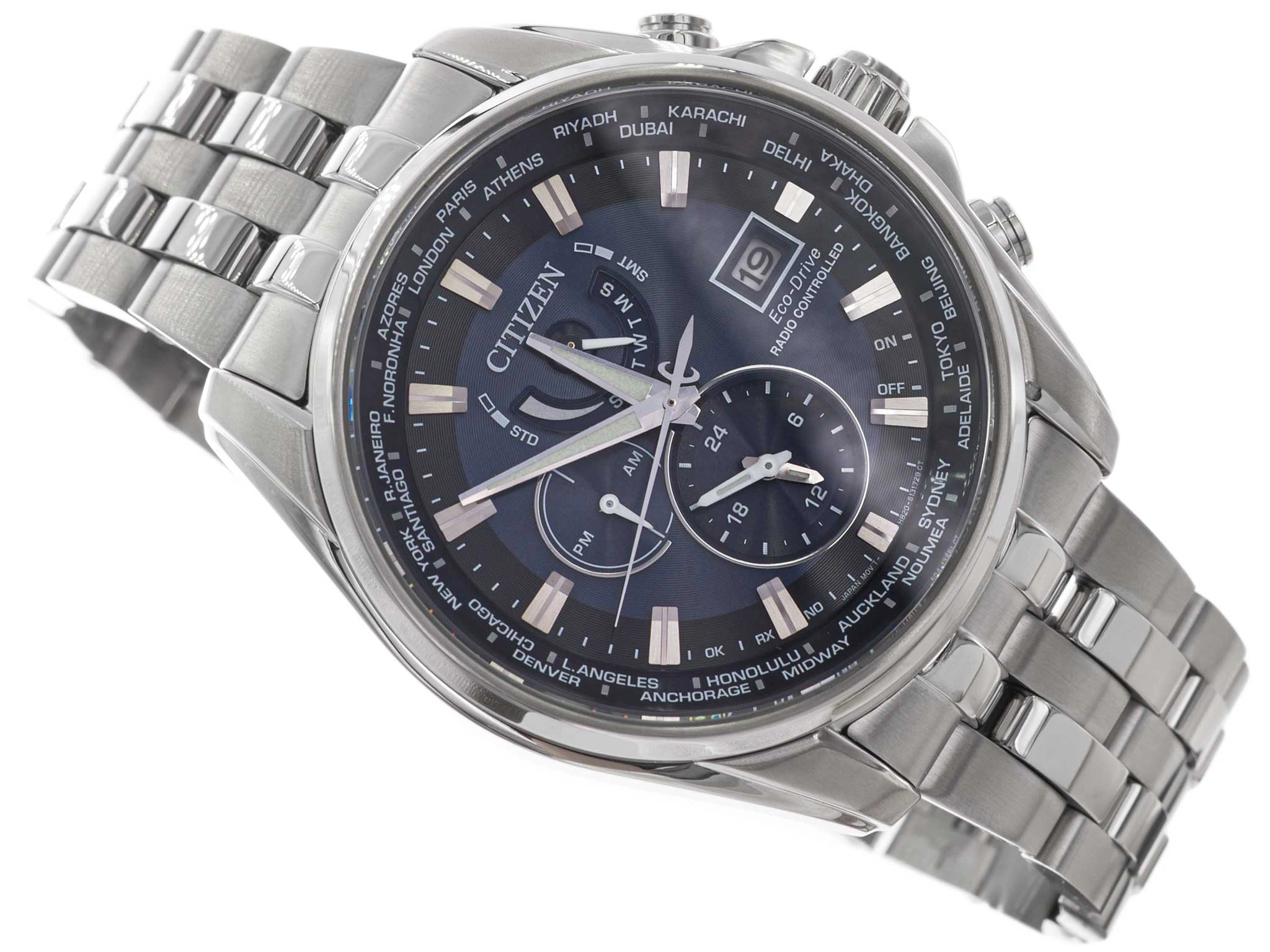 - Solarny Zegarek Męski Citizen AT9030-55L srebrny na bransolecie, posiada funkcję datownika, dual time, alarm neobrite. Zegarek wodoszczelny