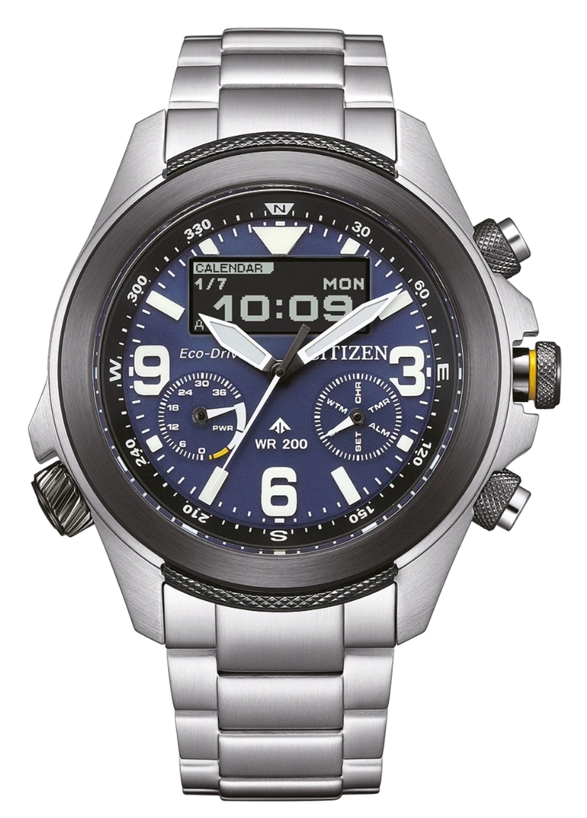 Bogata funkcjonalność modelu sprawia, że JV1006-51L to prawdziwe narzędzie do zadań specjalnych. Alarm pozwala ustawić powiadomienie dźwiękowe, które sprawdzi się zarówno w podróży, jak i podczas codziennego użytkowania. Dual Time umożliwia jednoczesne śledzenie czasu w dwóch strefach - idealne dla osób często przemieszczających się między krajami. Na tarczy znajdziemy także datownik, a dodatkowe funkcje, takie jak timer i stoper, znacząco podnoszą praktyczność zegarka w terenie. Wskazówki i indeksy zostały pokryte powłoką neobrite, która po wcześniejszym naświetleniu gwarantuje długotrwałą luminescencję, ułatwiając odczyt w ciemności. Na pokładzie znajduje się także podświetlenie LED pozwalające doświetlić cyfrowy wyświetlacz w absolutnej ciemności. Citizen JV1006‑51L Promaster Land Eco‑Drive jest więc nie tylko wytrzymałym narzędziem pomiaru czasu, lecz także niezawodnym kompanem w podróży, oferującym połączenie precyzyjnego wykonania, ekologicznej technologii i rozbudowanych funkcji wspierających użytkownika zarówno w codziennym życiu, jak i podczas wymagających ekspedycji. Spakowany w oryginalne opakowanie producenta będzie doskonałym pomysłem na prezent.