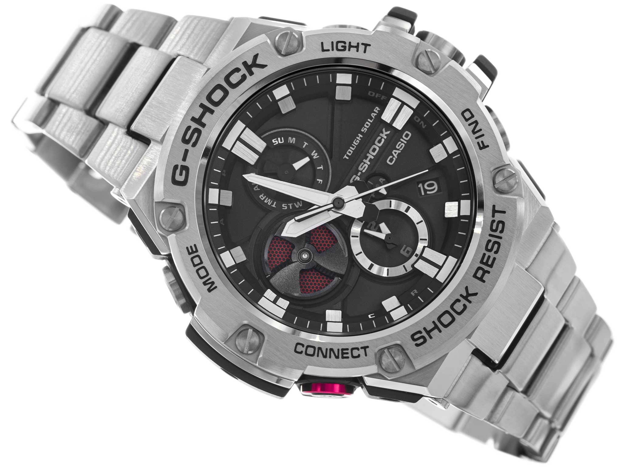 • Wodoszczelny Zegarek Męski Casio G-SHOCK GST-B100D 1AER srebrny na bransolecie, posiada funkcje takie jak stoper, timer, alarm, datownik Bluetooth. Zegarek solarny.