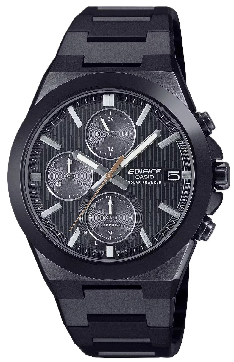 Casio Edifice EFS-S650DC-1AEF prezentuje estetykę zbudowaną na elegancji głębokiej czerni, która nadaje zegarkowi wyrazistego, nowoczesnego charakteru. Jednolita kolorystyka obejmująca kopertę, bransoletę i tarczę tworzy spójną, minimalistyczną kompozycję, w której każdy detal został dopracowany z typową dla serii Edifice precyzją. Cała konstrukcja została wykonana z wysokiej jakości stali szlachetnej. Czerń podkreśla geometryczną formę indeksów i wskazówek, które dzięki starannie dobranym akcentom świetnie kontrastują z matowym tłem, zachowując doskonałą czytelność w każdych warunkach. Bransoleta o płynnej linii dopasowuje się do nadgarstka, a zapięcie motylkowe gwarantuje pewność noszenia i wygodę podczas codziennych aktywności. Tarczę chroni szkło szafirowe, które zabezpiecza powierzchnię przed uszkodzeniami, pozwalając zachować nienaganną przejrzystość przez długi czas. Zegarek wyposażono w mechanizm solarny, który czerpie energię ze światła i eliminuje konieczność wymiany baterii. Wysoka wodoszczelność pozwala swobodnie korzystać z zegarka podczas pływania, a obecność praktycznych funkcji, takich jak analogowy stoper, datownik i wskaźnik dobowy, sprawia, że model wyróżnia się nie tylko wyglądem, lecz także funkcjonalnością. Całość została zaprojektowana tak, aby harmonijnie łączyć sportową energię z elegancką formą. Casio Edifice EFS-S650DC-1AEF to propozycja o zdecydowanej, nowoczesnej osobowości, która podkreśla indywidualny styl i dodaje każdej stylizacji intensywnego, wyrazistego akcentu. Zegarek został spakowany w oryginalne opakowanie producenta, które sprawdzi się również w charakterze opakowania na prezent.